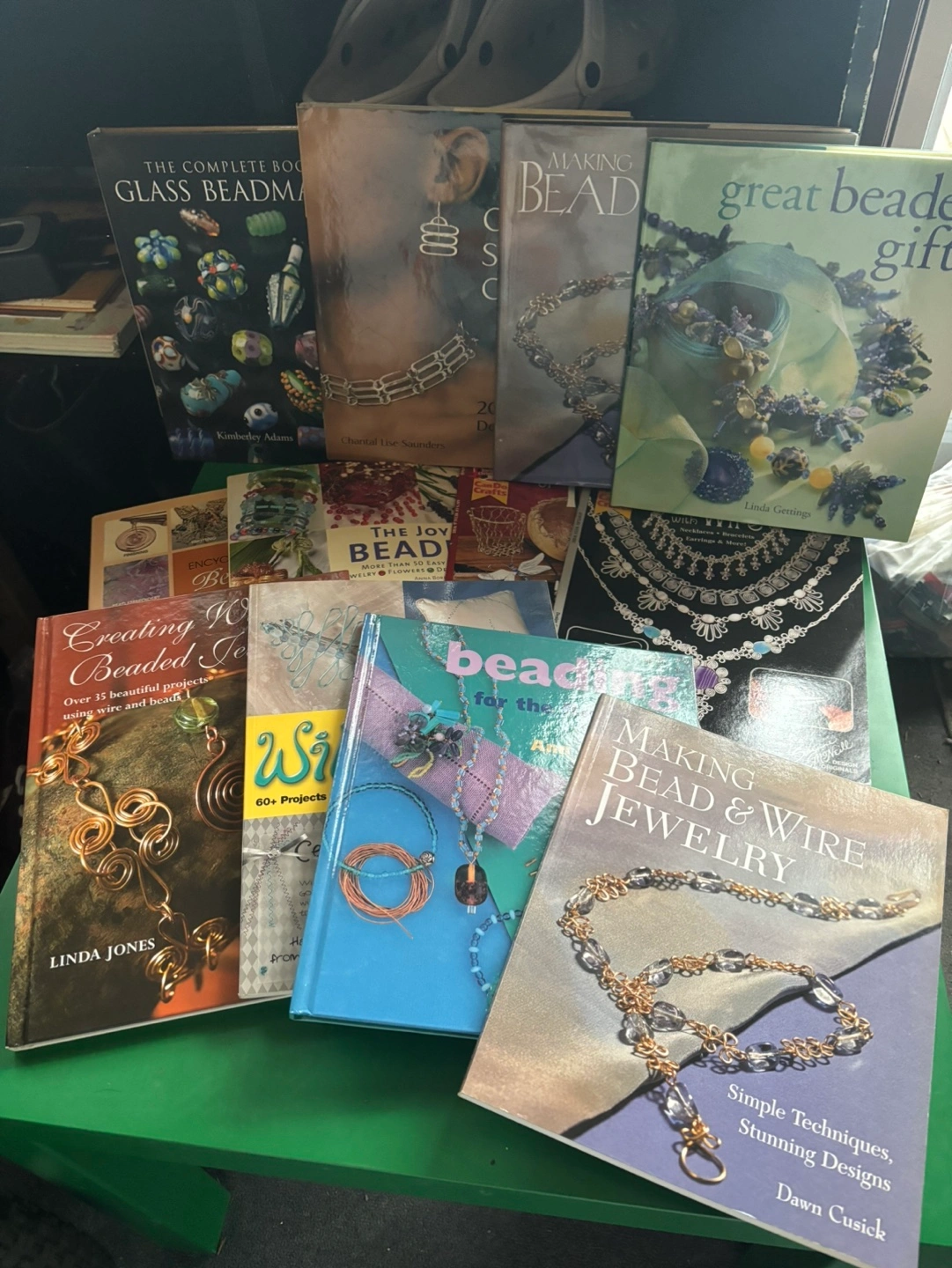 Lot of beading books. Titles include The Complete Book of Glass Beadmaking, Making Bead Crafts, Great Beaded Gifts, Creating Beaded Jewelry, The Joy of Beading, Beading for the Absolute Beginner, and Making Bead and Wire Jewelry.