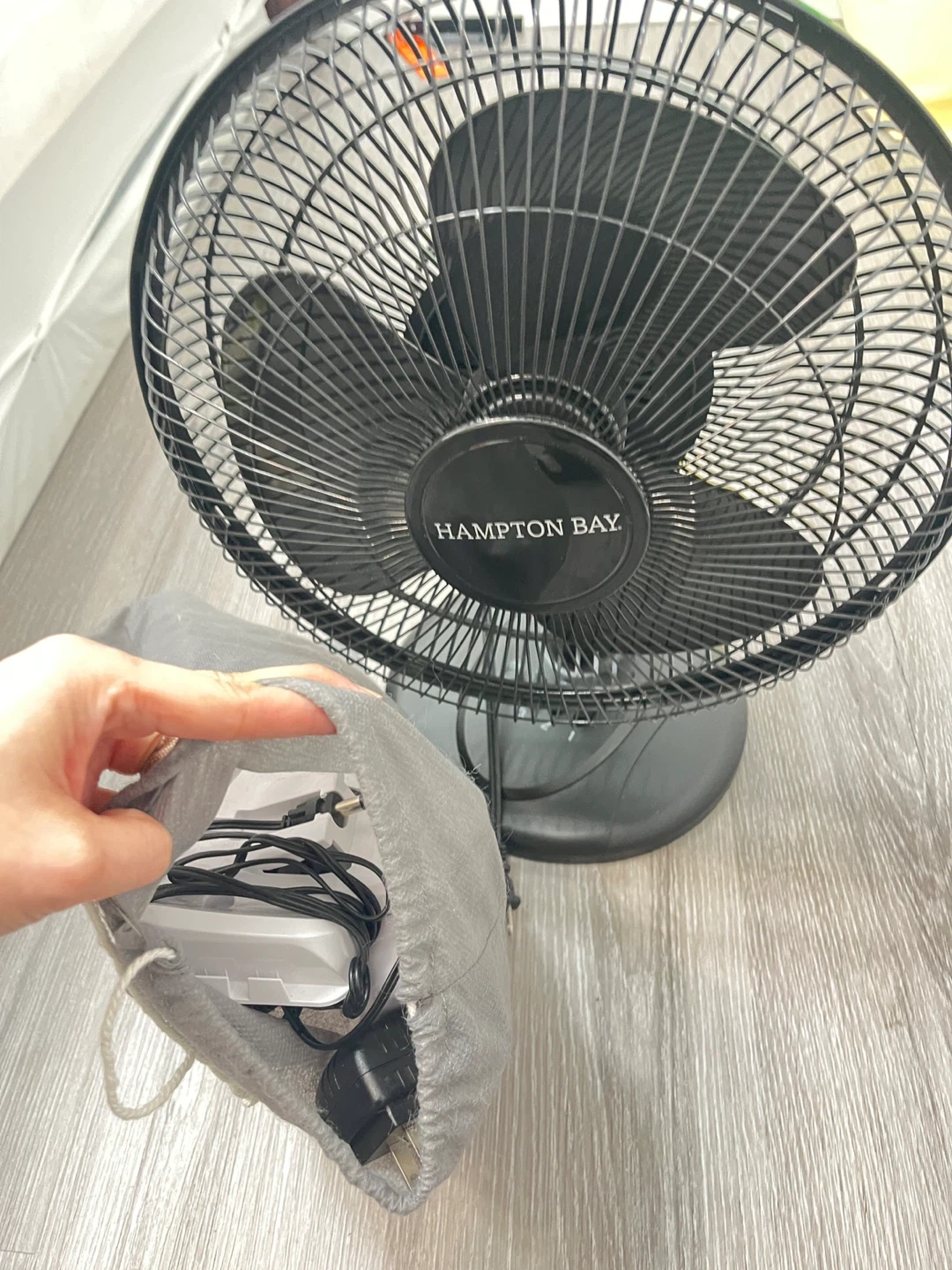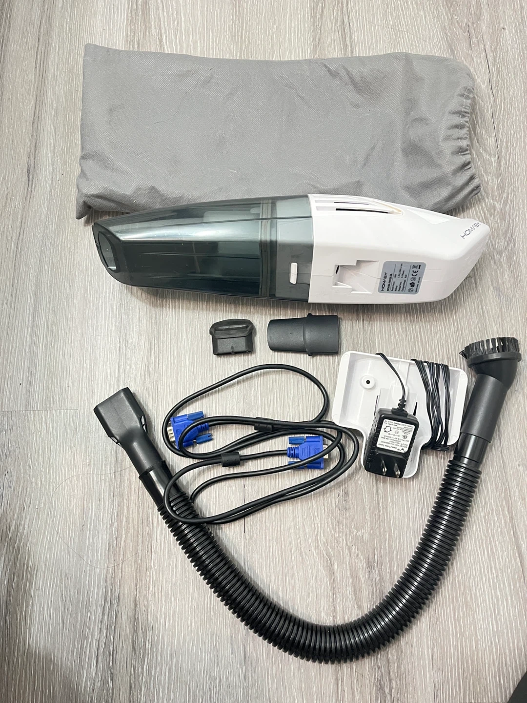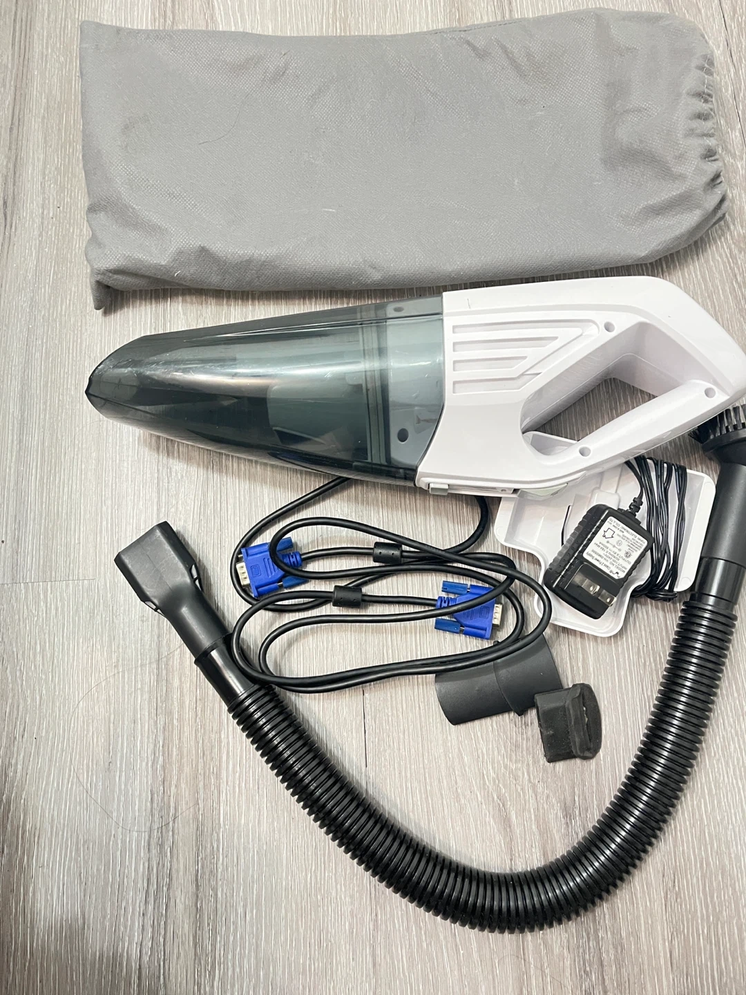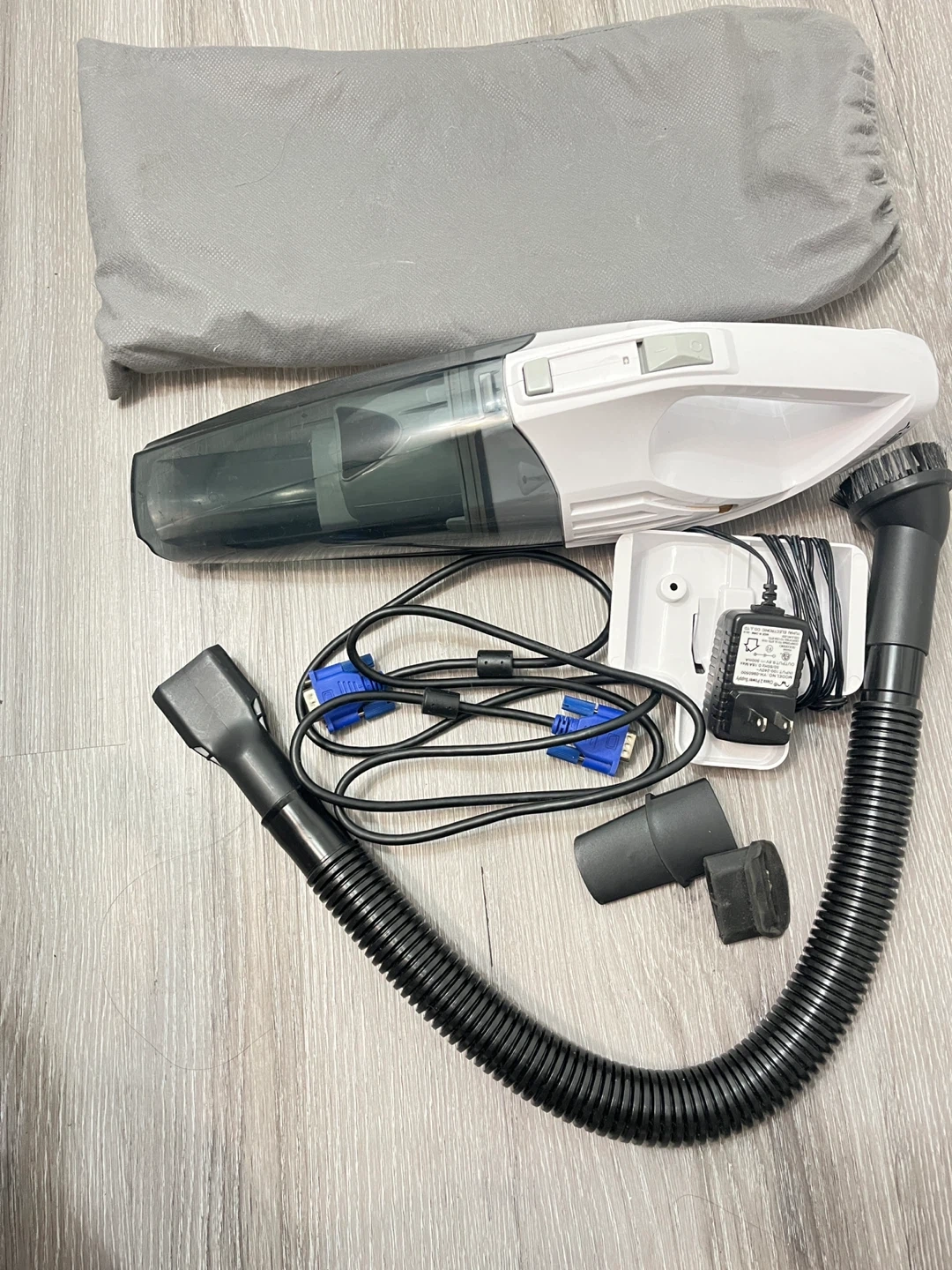 This Hometech handheld vacuum cleaner is white and grey. It comes with a charging adapter, a flexible hose, and two brush attachments. It also includes a grey storage bag. This vacuum is great for quick cleanups around the house or in your car! With free Hampton bay fan.