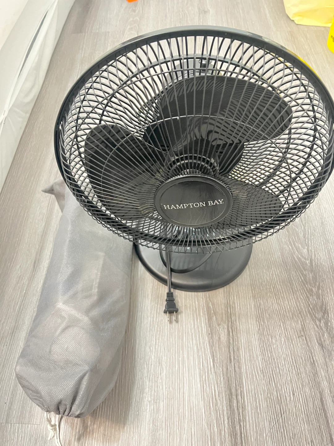 This Hometech handheld vacuum cleaner is white and grey. It comes with a charging adapter, a flexible hose, and two brush attachments. It also includes a grey storage bag. This vacuum is great for quick cleanups around the house or in your car! With free Hampton bay fan.