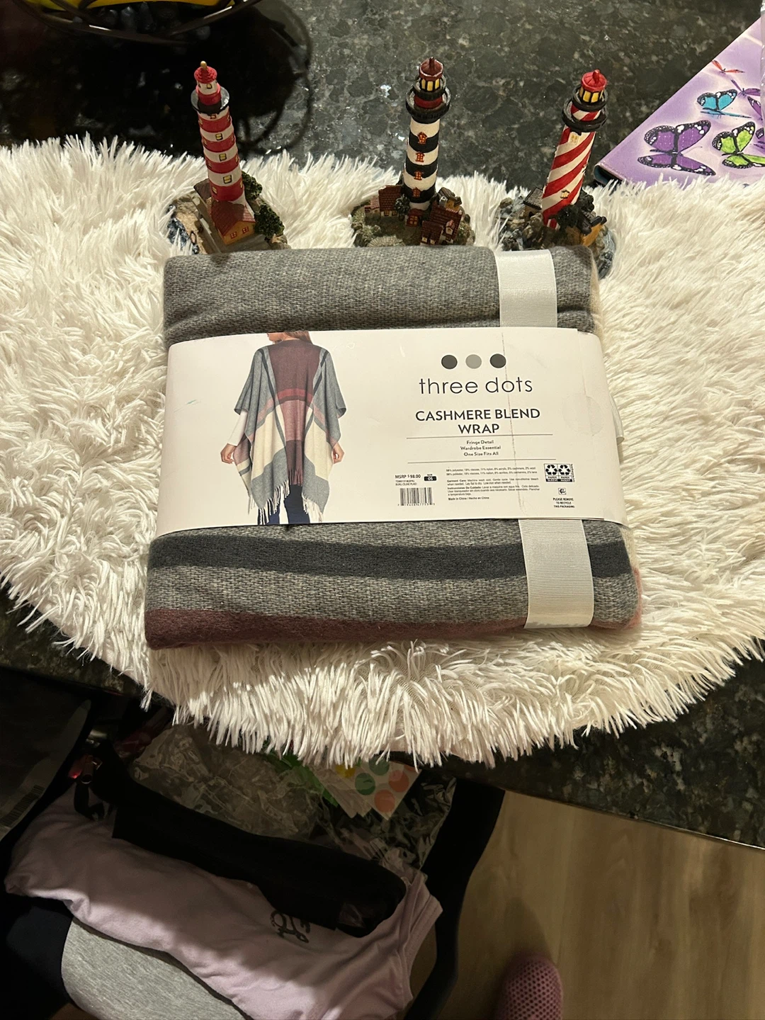 This is a Three Dots Cashmere Blend Wrap in One Size. It features fringe detail and is a wardrobe essential! The material is 56% polyester, 18% viscose, and 11% nylon. Originally bought for $98