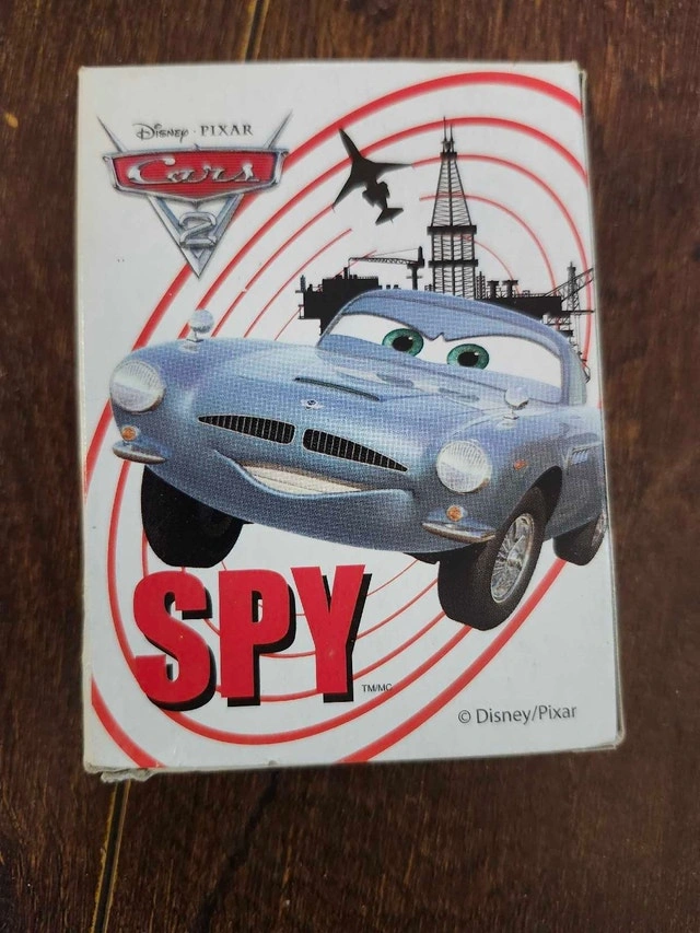 Dive into the world of espionage with this Disney Pixar Cars Spy card game! This used card game features Finn McMissile and other beloved characters. The box shows some wear, but all the cards are included and ready for action. Perfect for family game night or for collectors. Get ready for hours of fun and intrigue! If the ad is up, the cards are still here, ready to be dealt into your hands. Don't miss out on the chance to add a bit of Cars excitement to your life!
