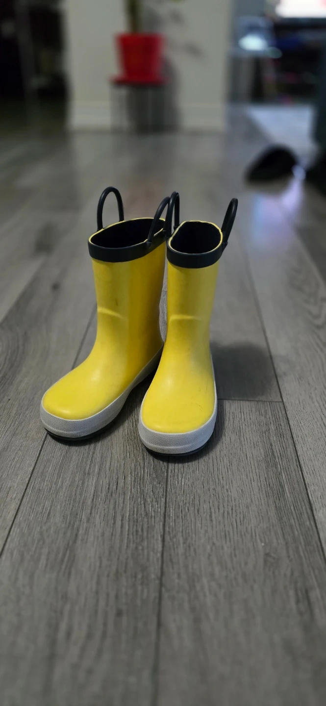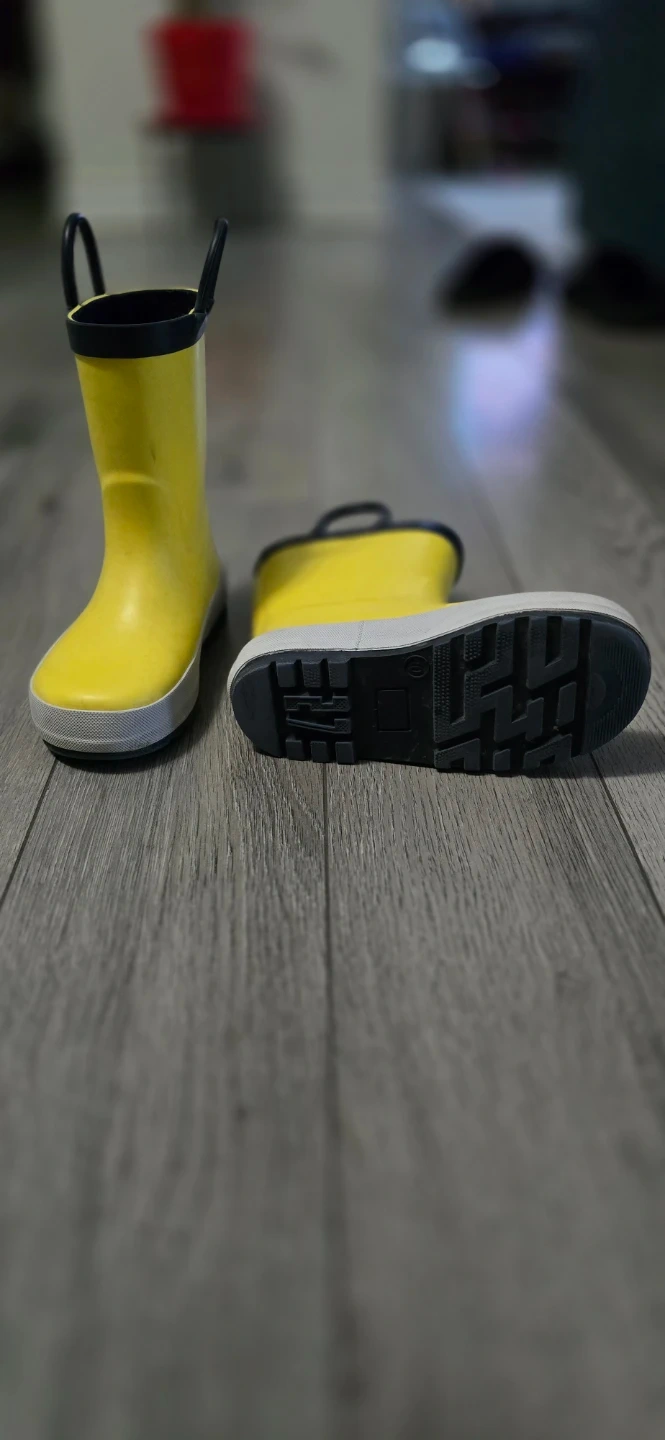 These bright yellow rain boots are ready for puddles! They're made of waterproof rubber and feature easy-pull handles. Kids' footwear for wet weather adventures.