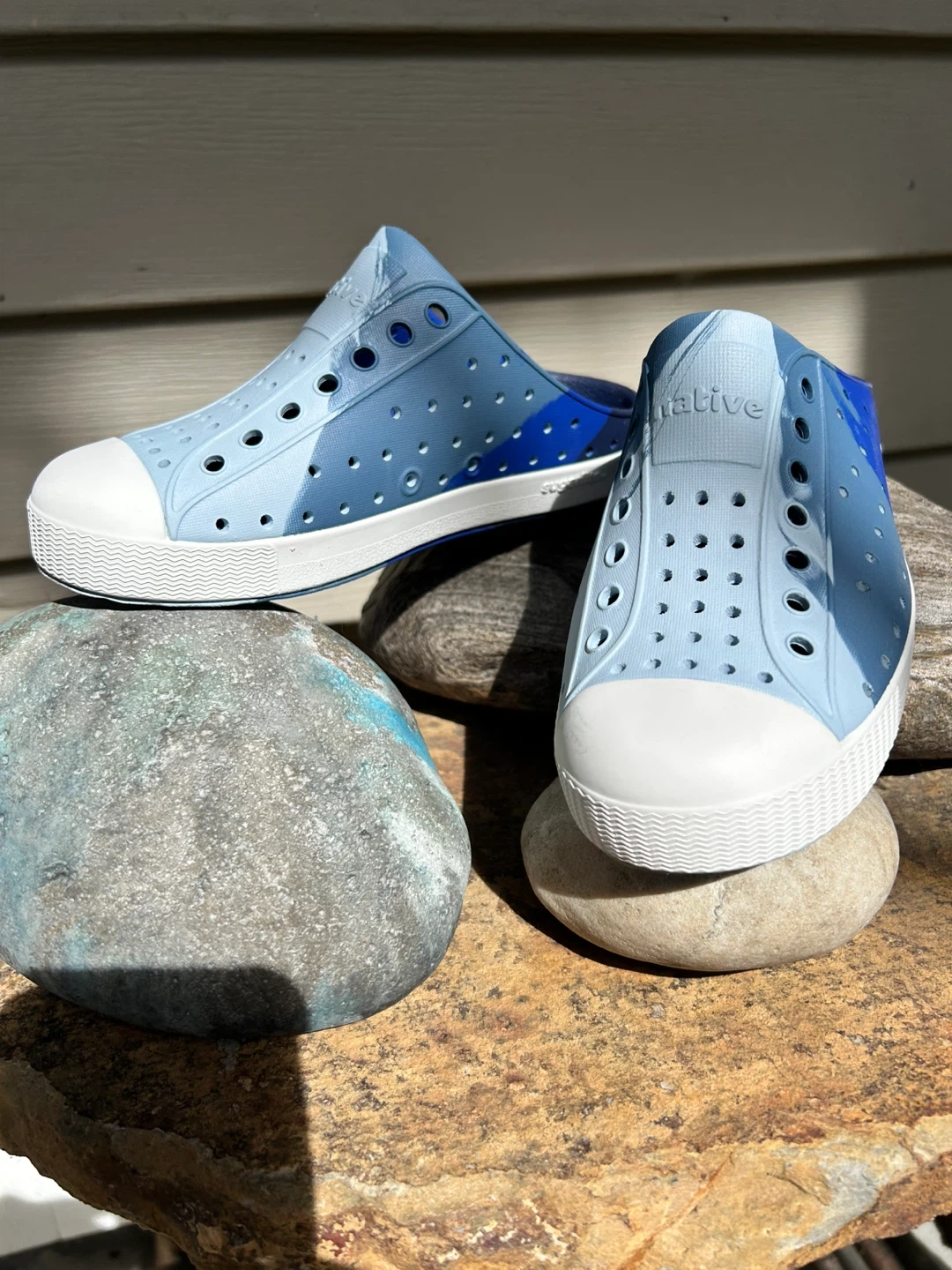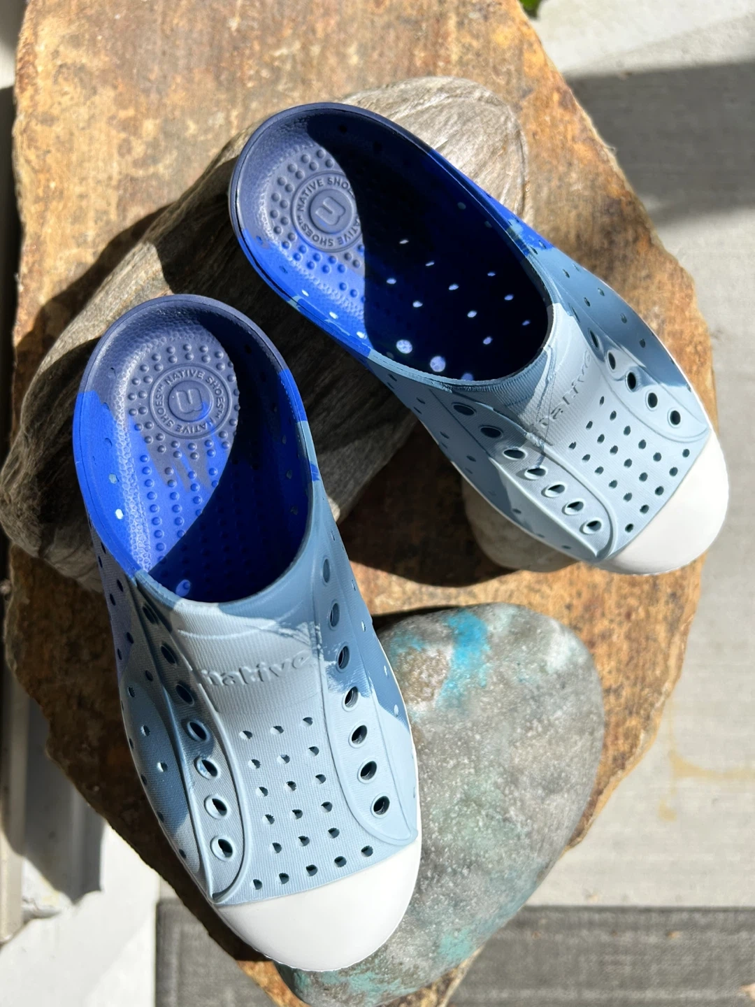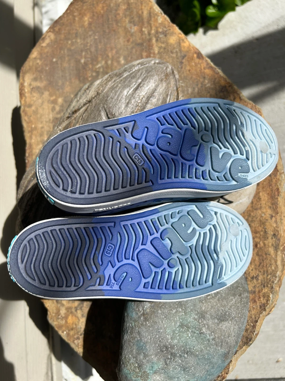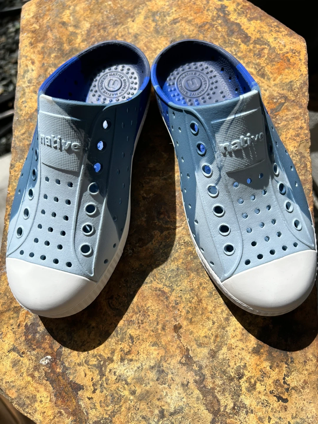 These Native Jefferson Lite slip-on shoes are a kids' size children’s 13. They're made of lightweight, durable EVA material in a blue camouflage pattern. They're easy to clean and perfect for active kids!