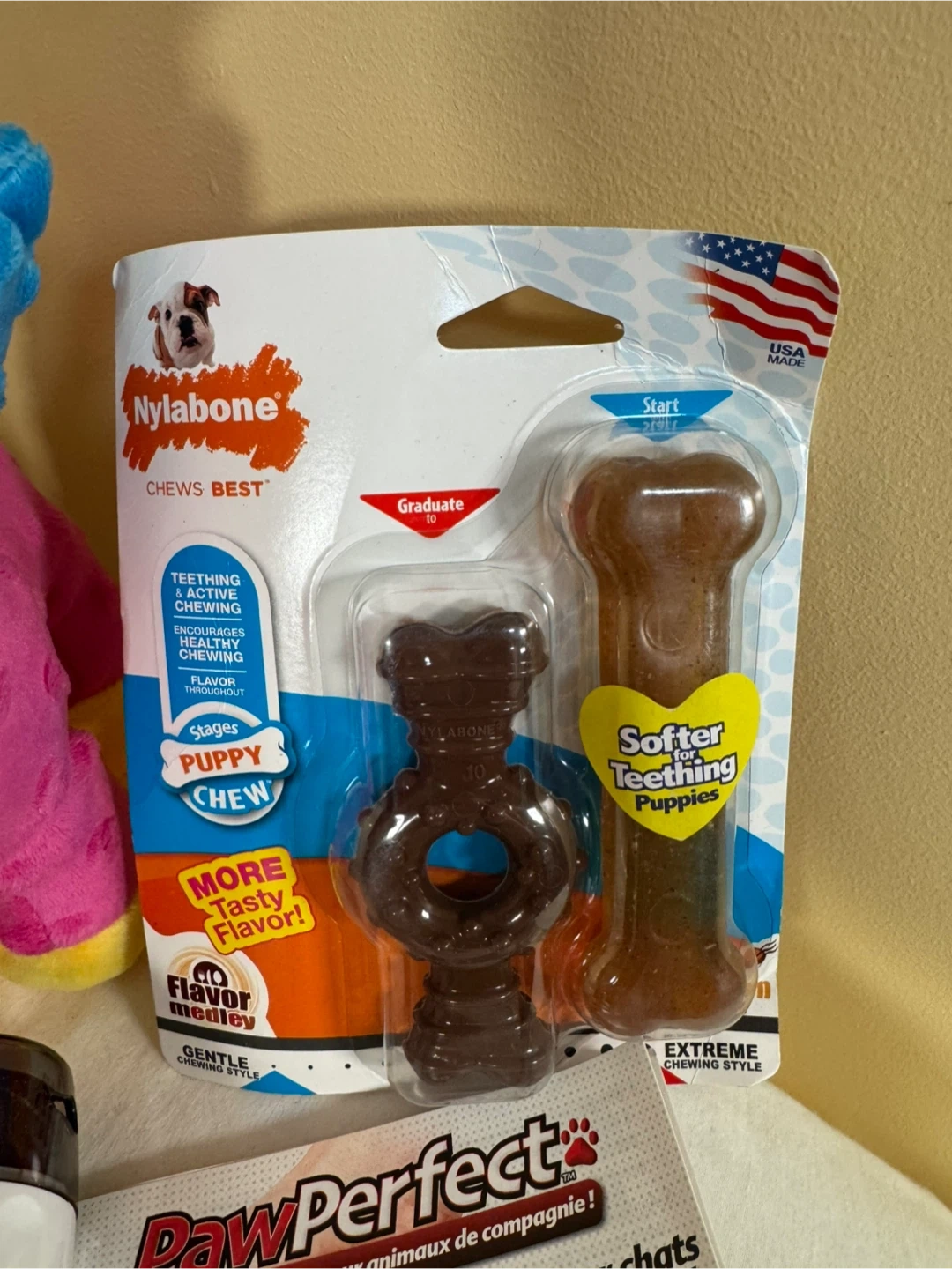 PawPerfect pet nail grinder comes with 3 grinding drums. Nylabone puppy chew toys are great for teething. Also includes a Go Dog plush toy.