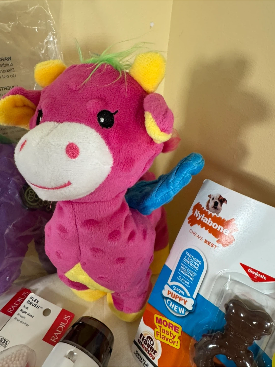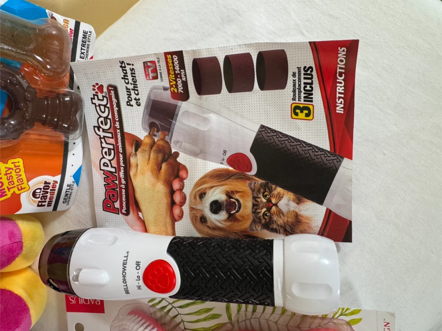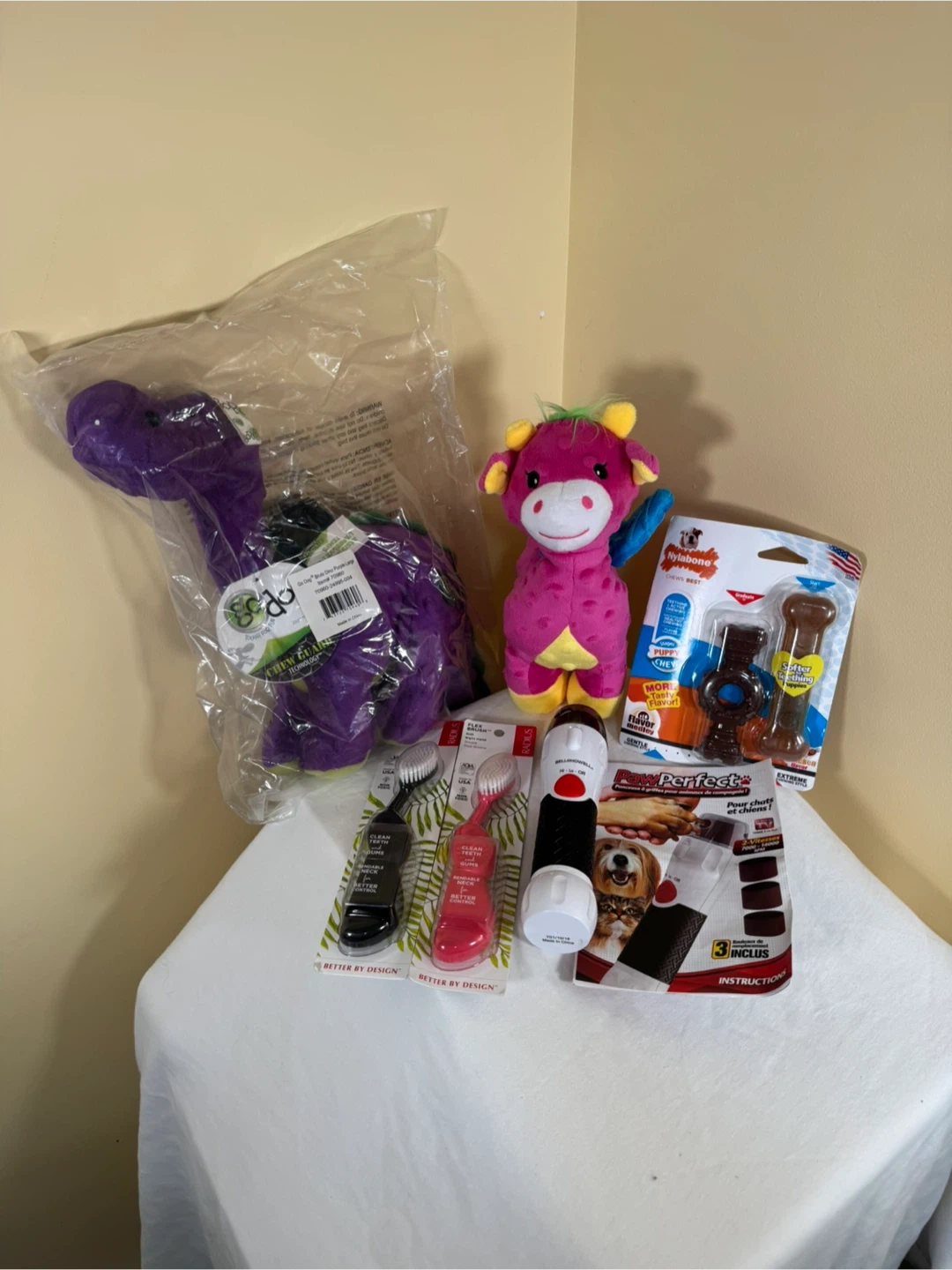 PawPerfect pet nail grinder comes with 3 grinding drums. Nylabone puppy chew toys are great for teething. Also includes a Go Dog plush toy.