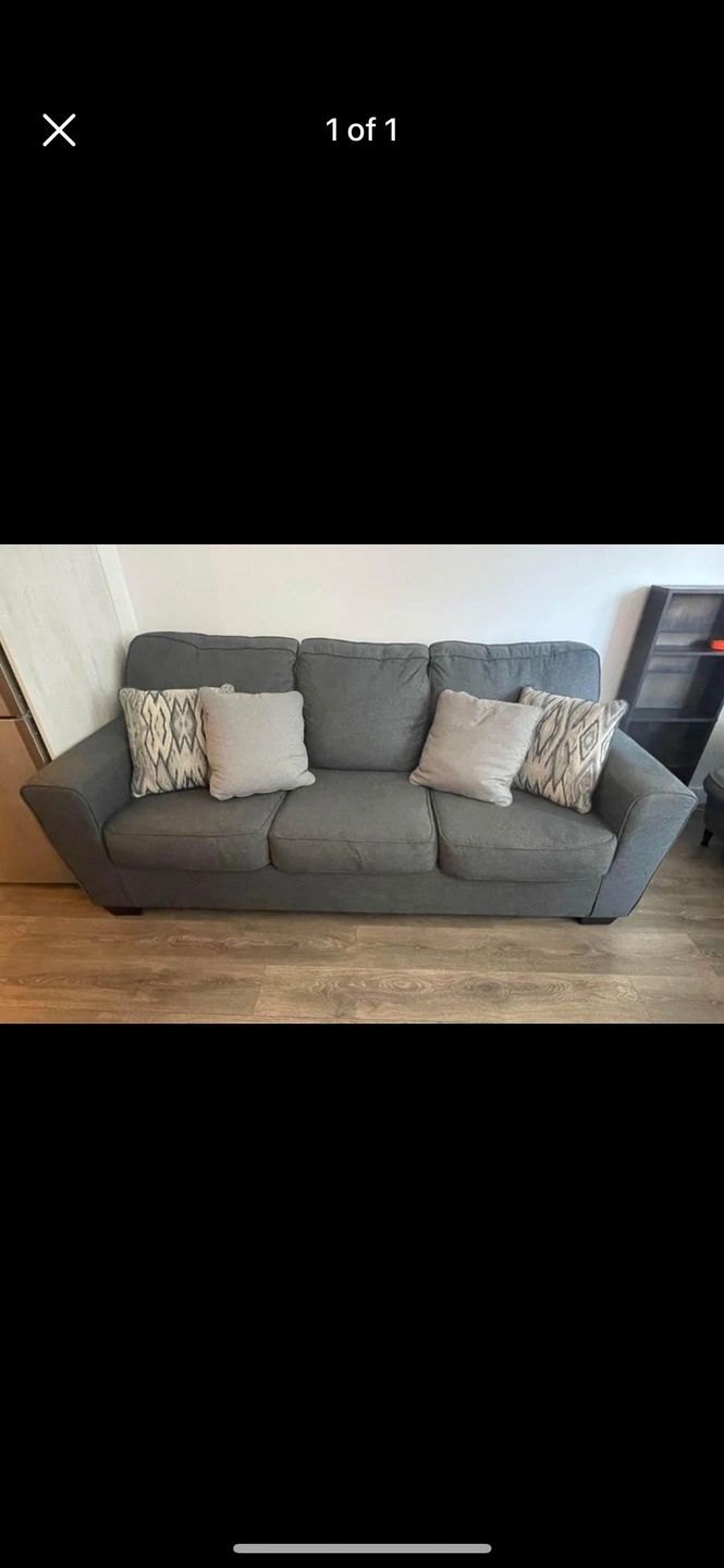 Enhance your living room with this comfortable and stylish grey sofa. Perfect for any modern home, this sofa offers ample seating and comes with four cozy cushions, including two with a chic geometric pattern.