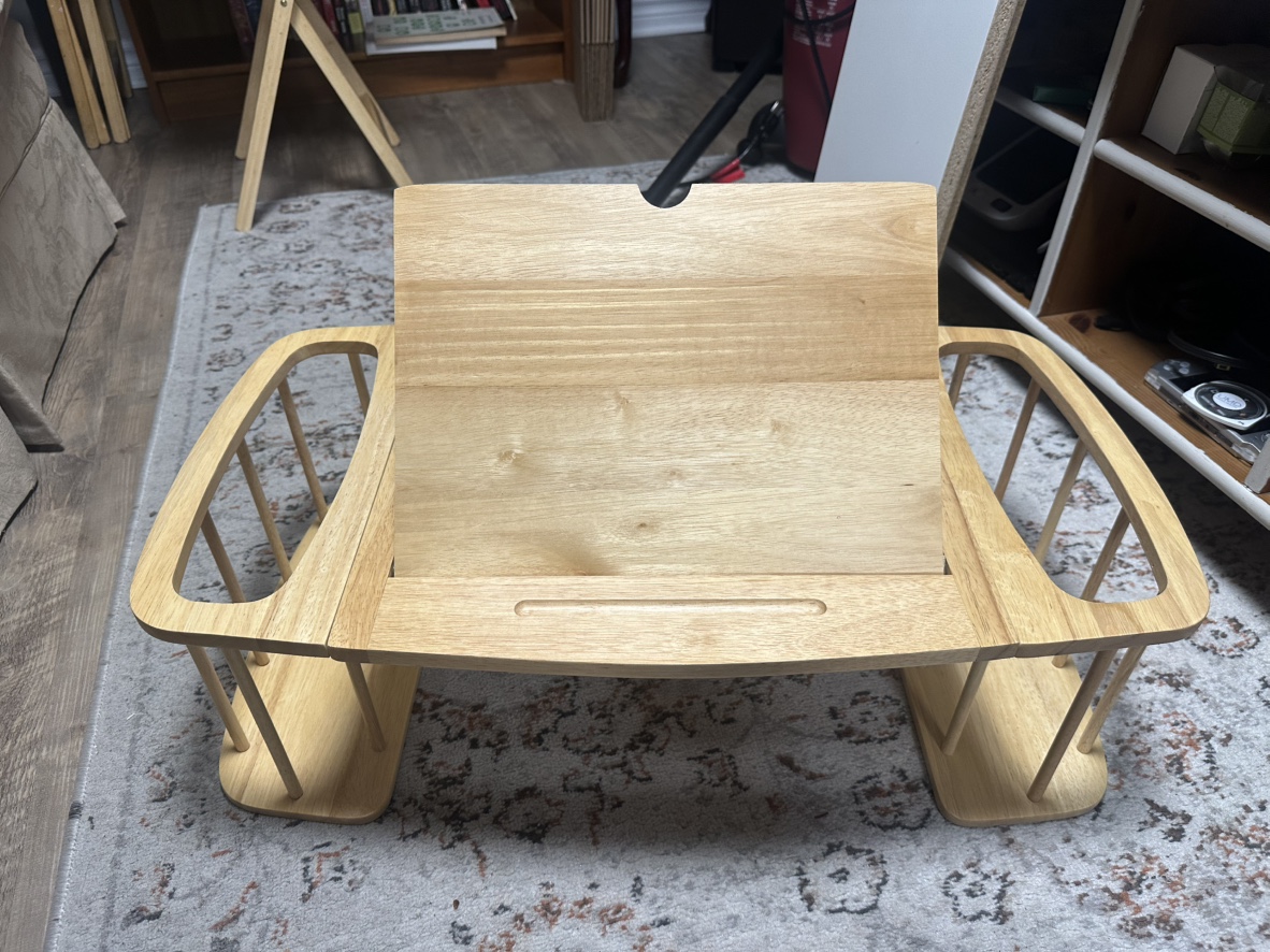 A wooden bed tray with a lift-up lid and side supports. The bed tray is great for eating in bed, working on a laptop, or reading. It folds flat for easy storage.