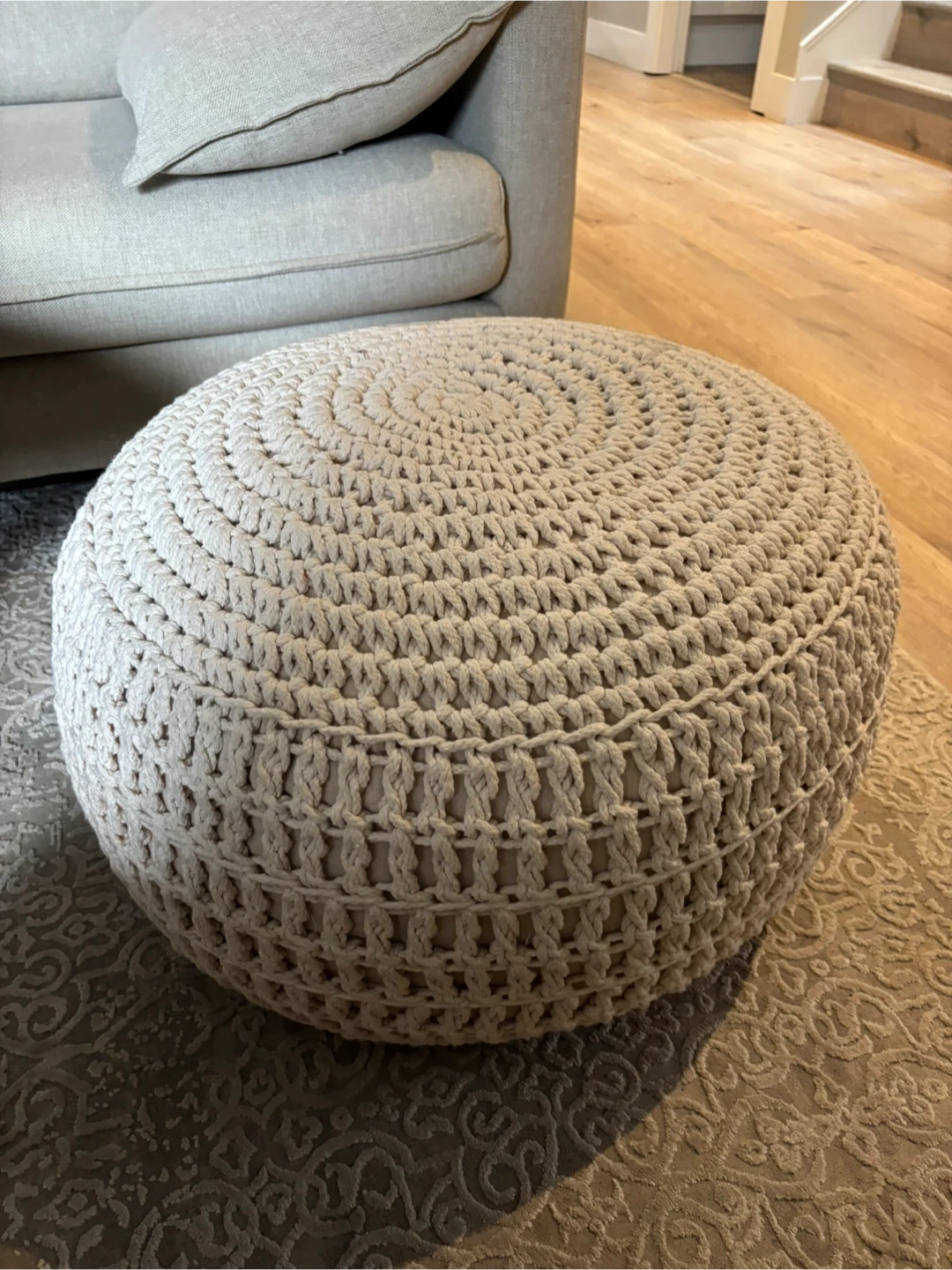 Chic crochet pouf ottoman in cream colour. It's perfect for adding a cozy touch and extra seating to any room. Sturdy based, similar to bean chairs.