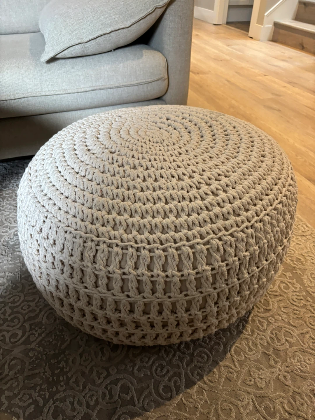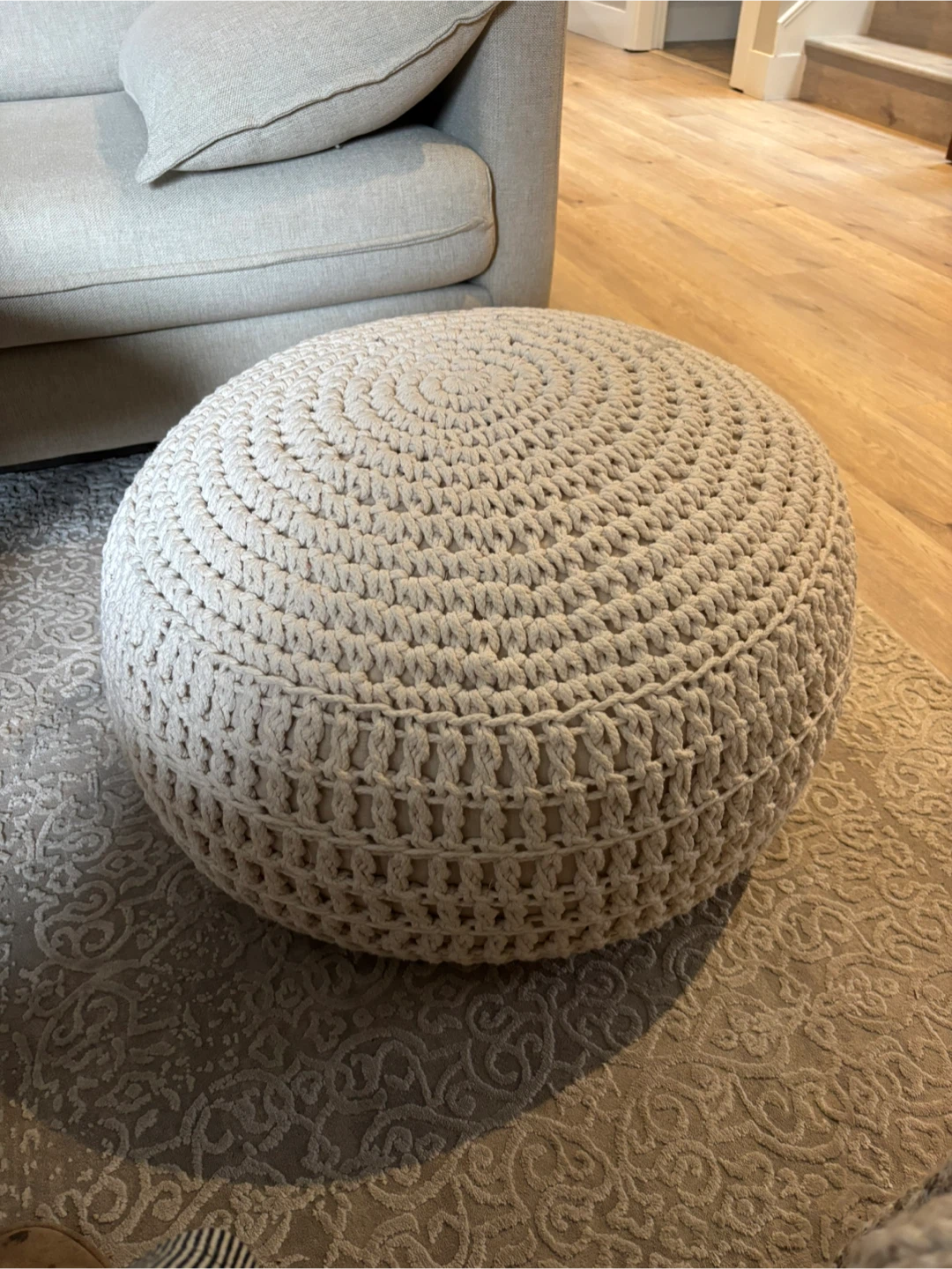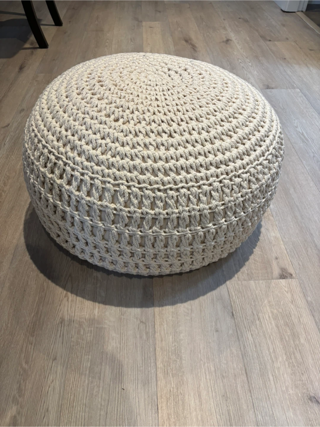 Chic crochet pouf ottoman in cream colour. It's perfect for adding a cozy touch and extra seating to any room. Sturdy based, similar to bean chairs.