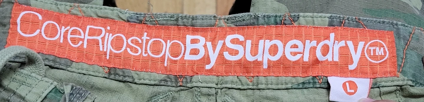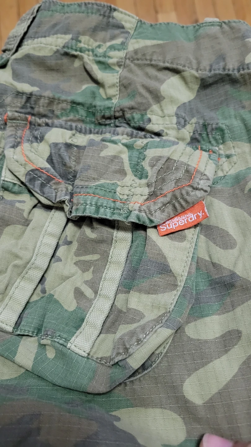 Superdry camo cargo pants in ripstop fabric. These pants are size Large. They feature multiple pockets.