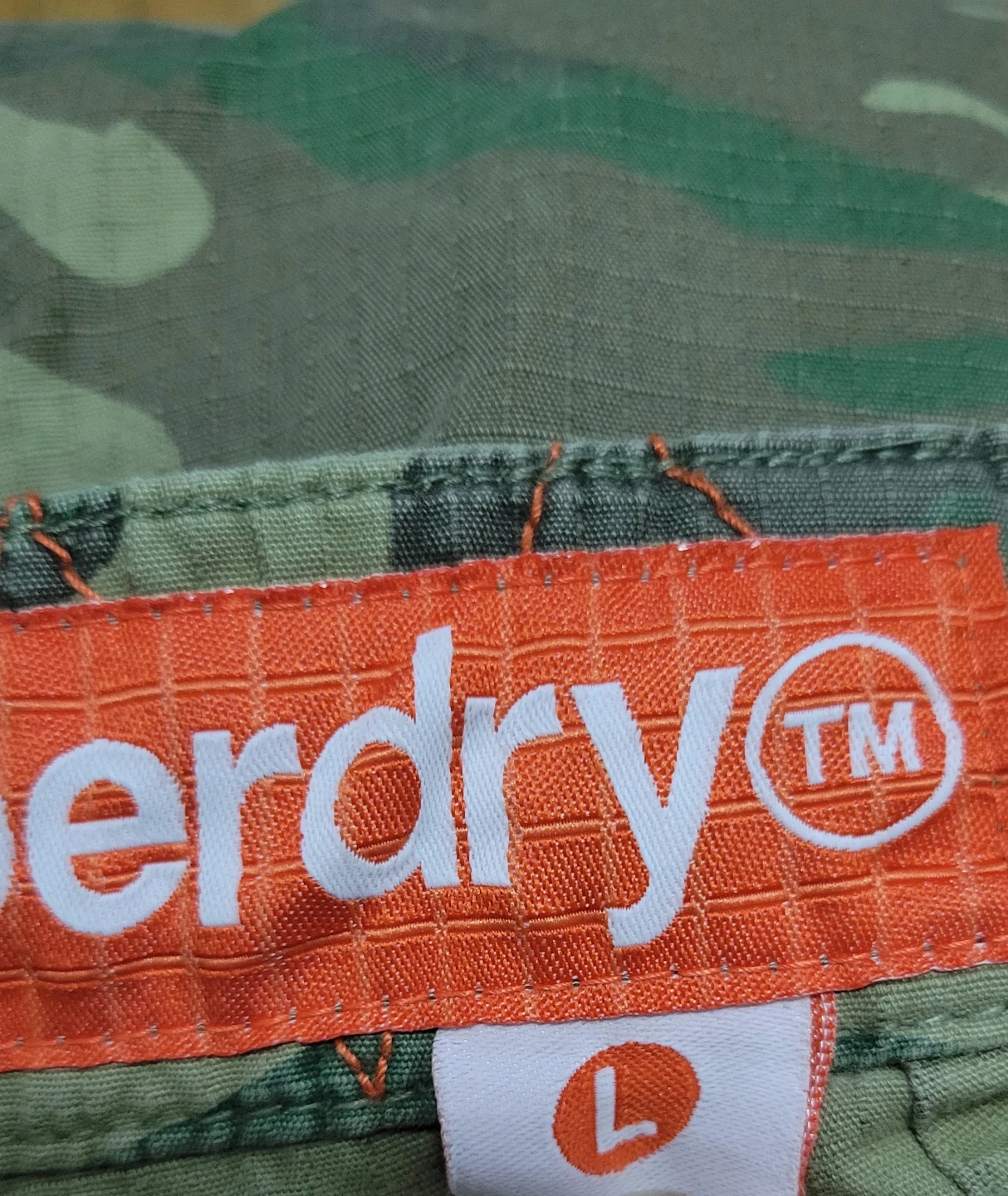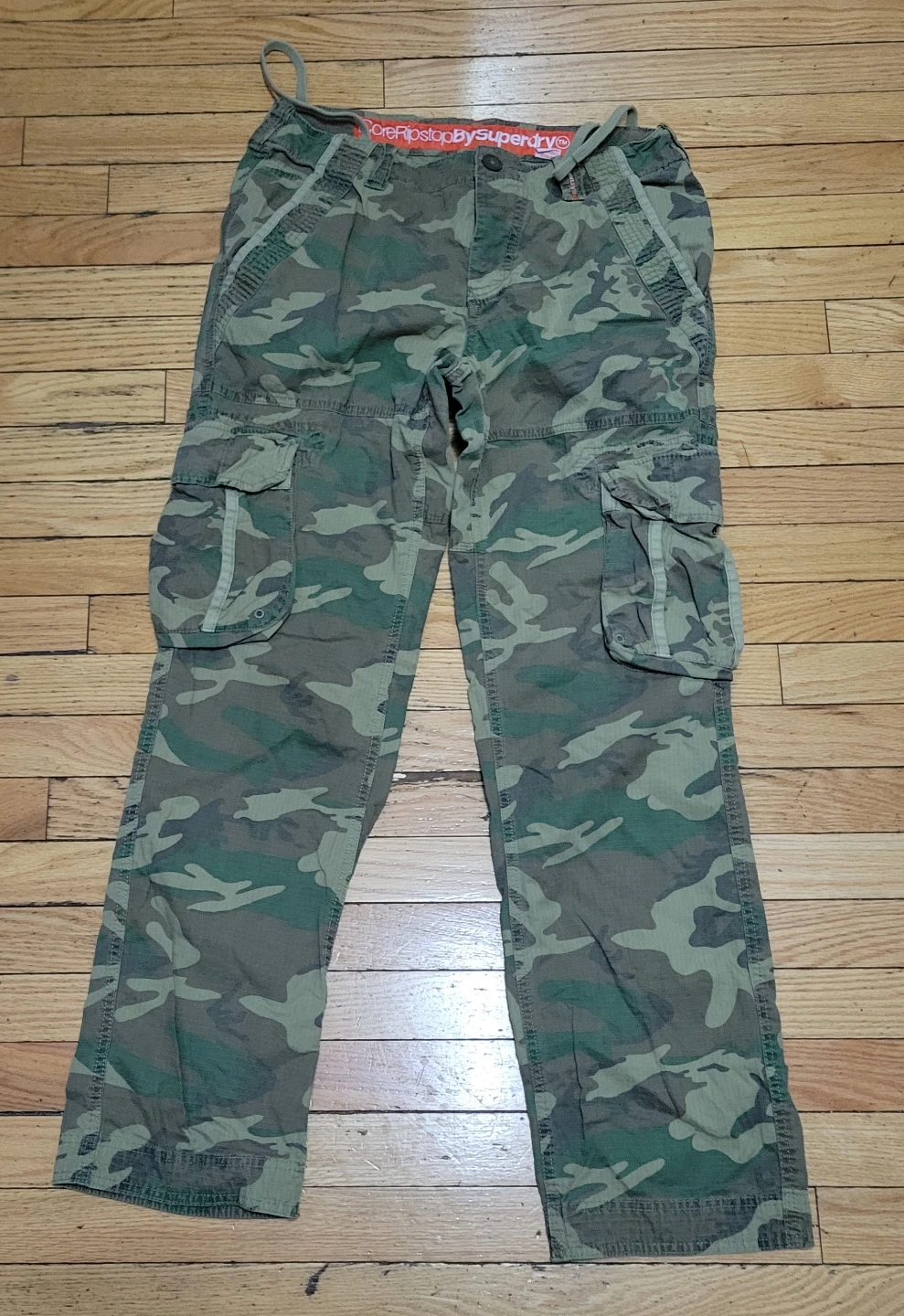 Superdry camo cargo pants in ripstop fabric. These pants are size Large. They feature multiple pockets.