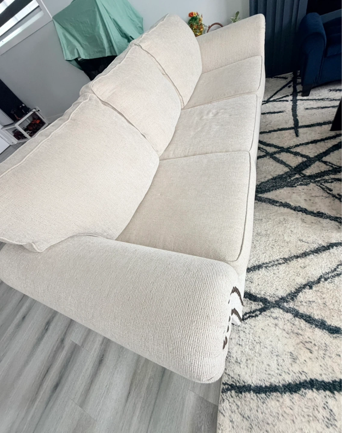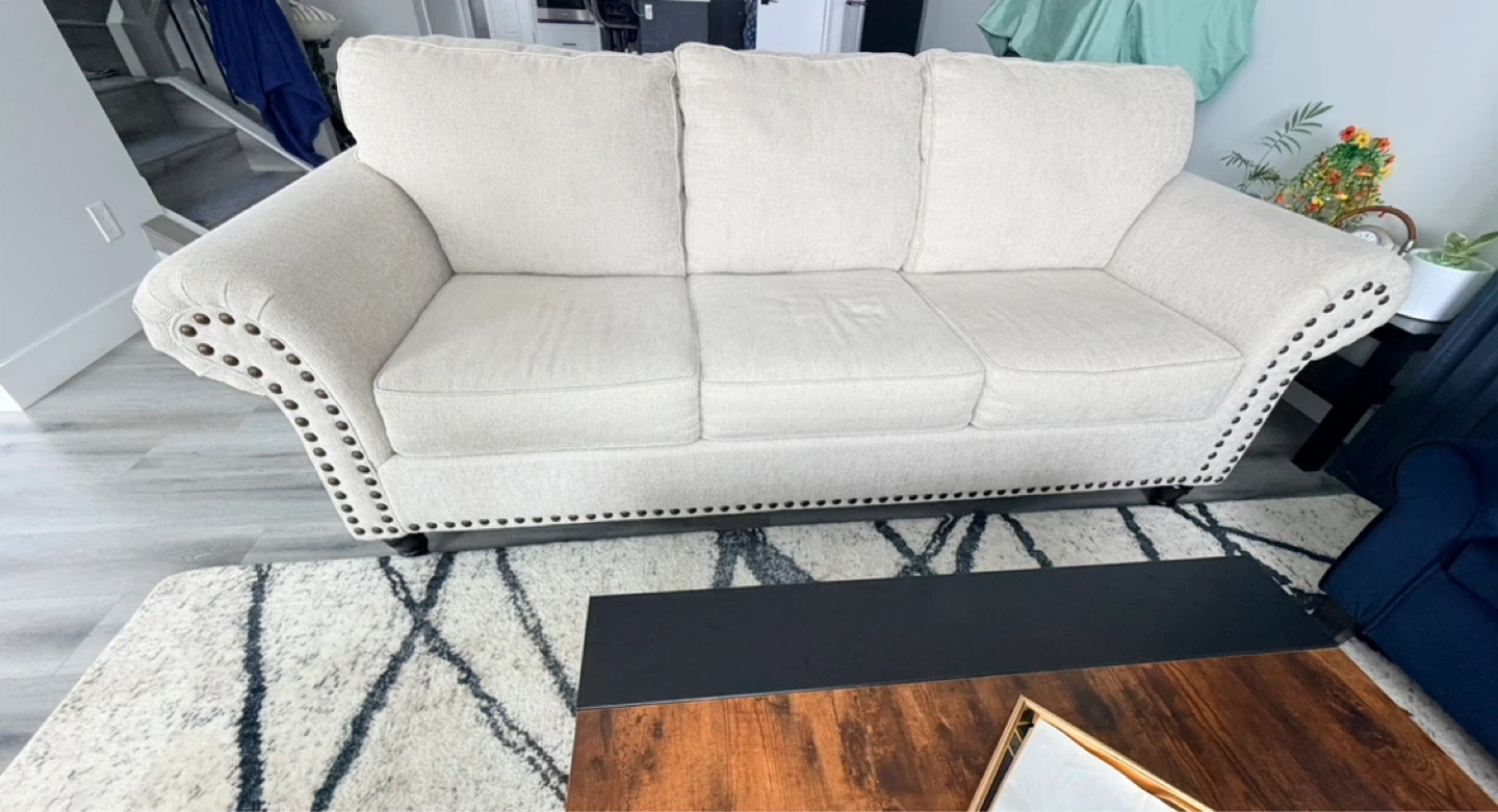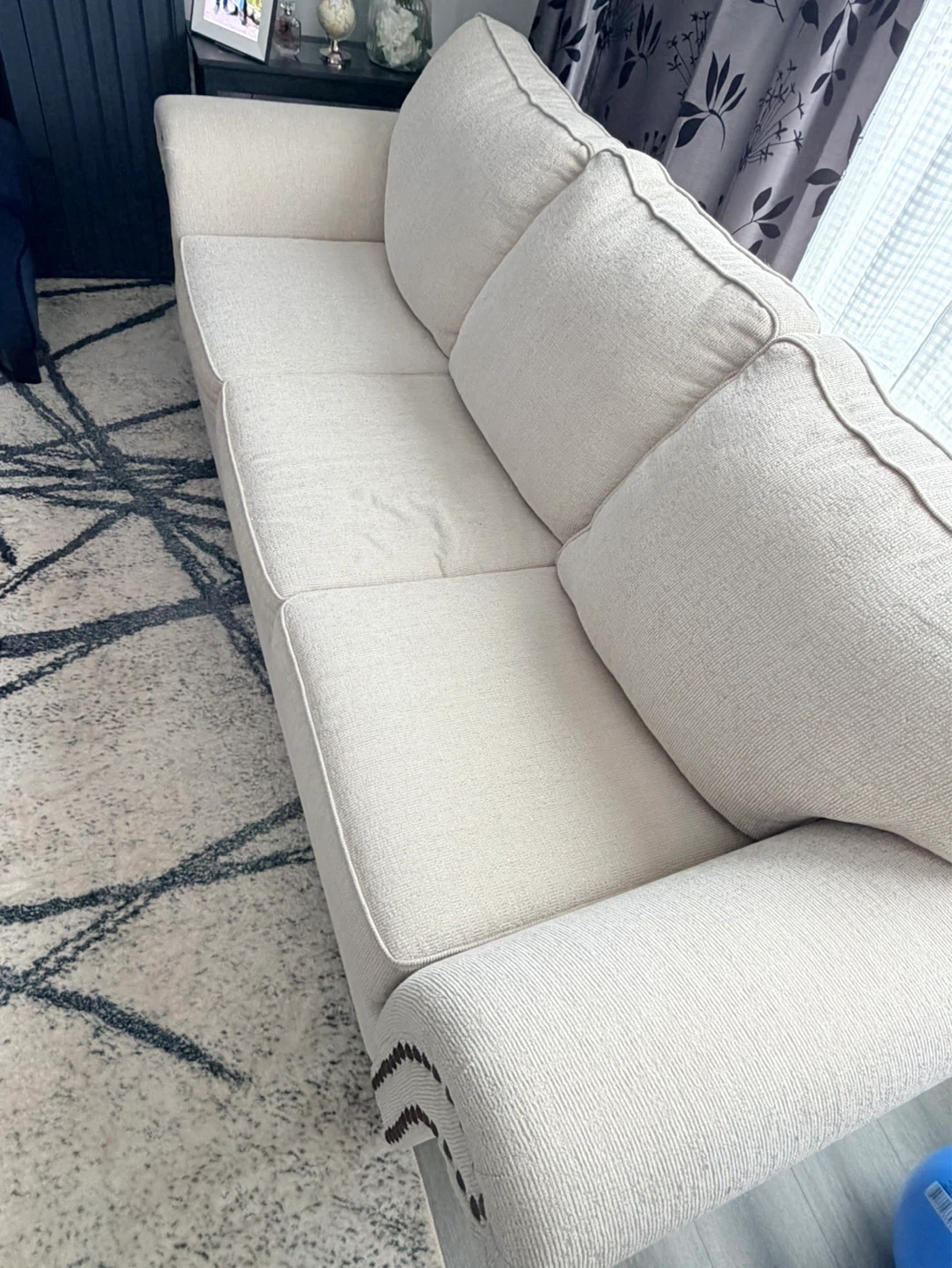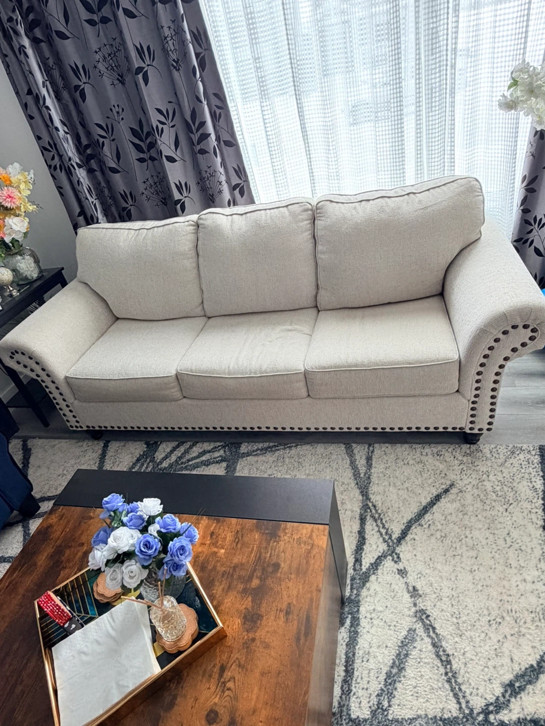 Comfortable beige sofa with plush cushions. It's upholstered in a durable fabric. This 2 Pair sofa offers seating for three. Great for a living room or den!