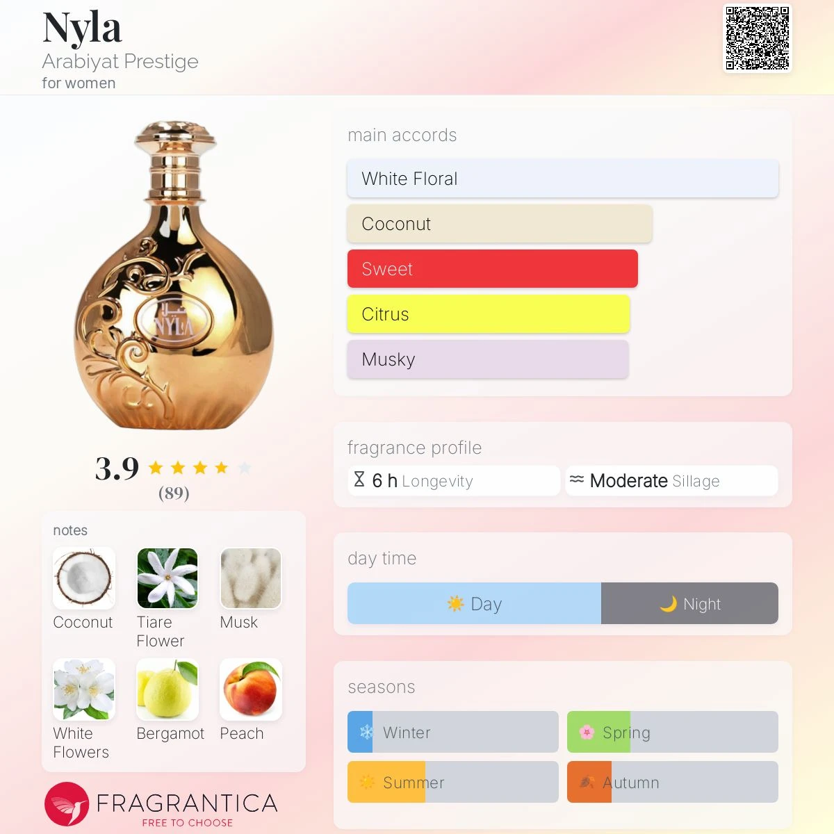 This is Arabiyat Prestige Nyla Eau de Parfum for women. It's a 80ml (2.7 fl. oz.) bottle with a captivating scent. Notes include coconut, tiare flower, musk, white flowers, bergamot, and peach. It's recommended for day time wear, suitable for all seasons, and offers 6 hours of longevity.