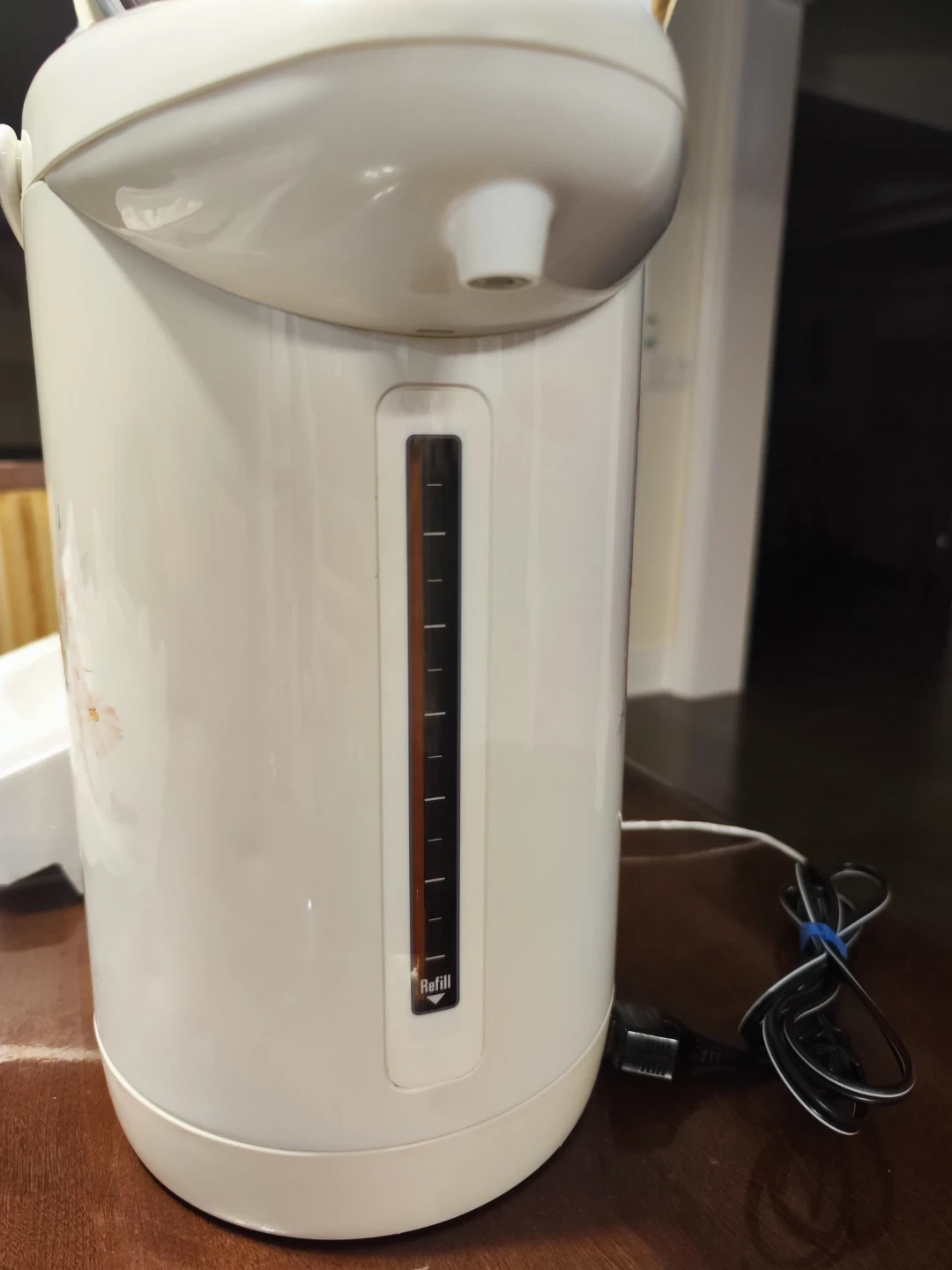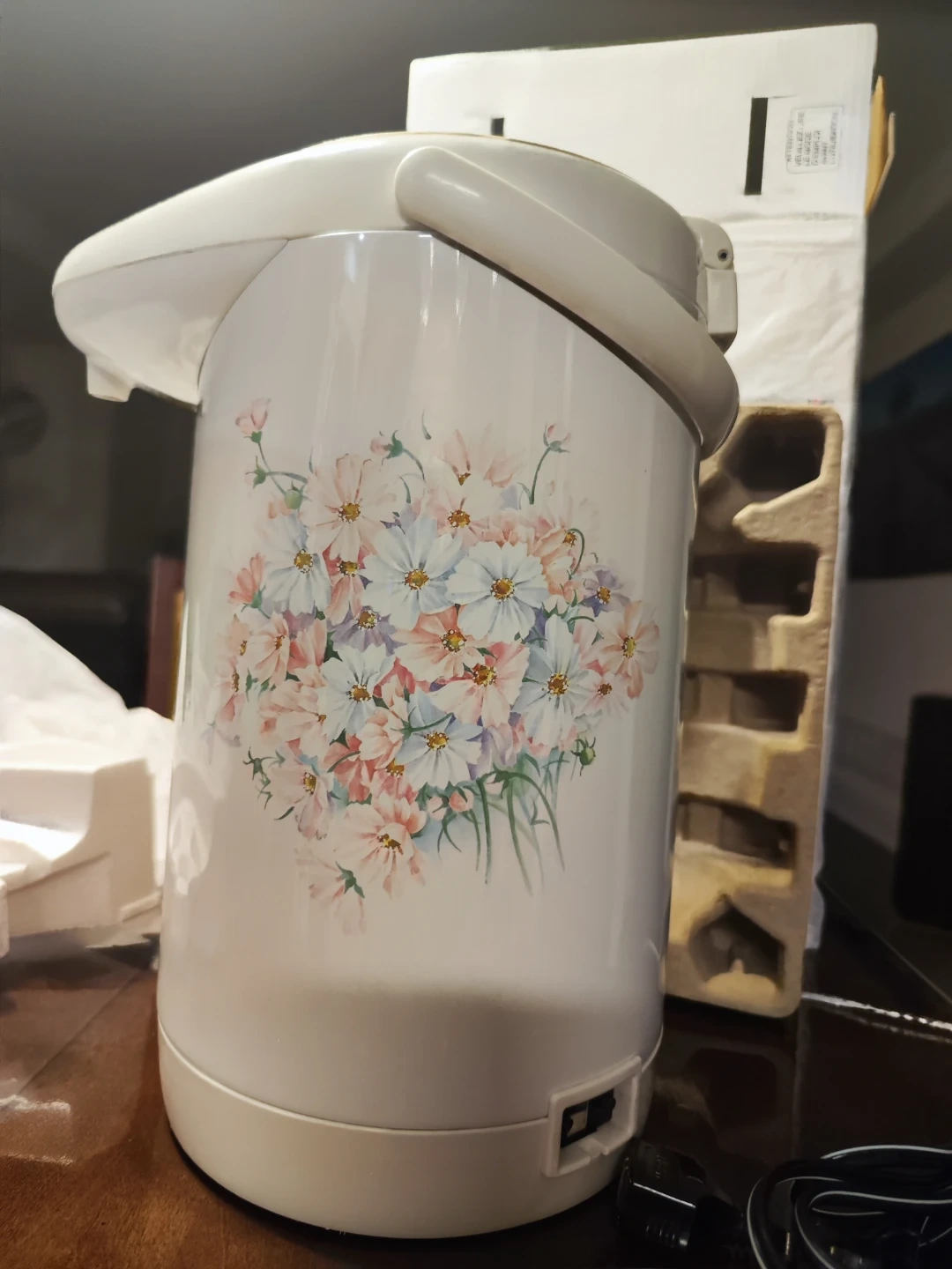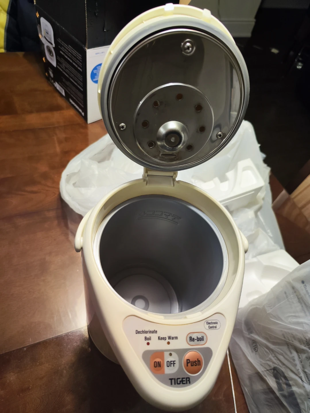 This Tiger electric water boiler thermos is perfect for keeping water hot. It features electronic control with functions like Dechlorinate, Boil, Keep Warm, and Re-boil. It has a clear water level indicator on the side. Ideal for busy households needing instant hot water!