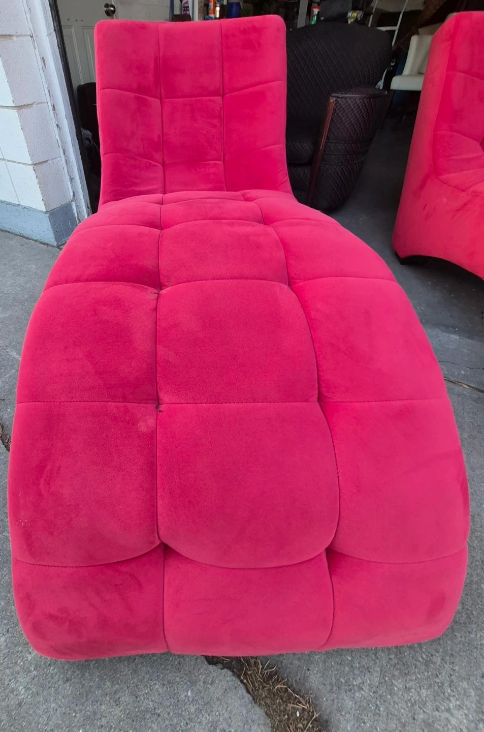 A vibrant pink chaise lounge chair with a tufted design. Its fabric appears to be a soft velvet material. Perfect for adding a pop of colour and comfort to any room. This lounge chair offers a stylish place to relax.