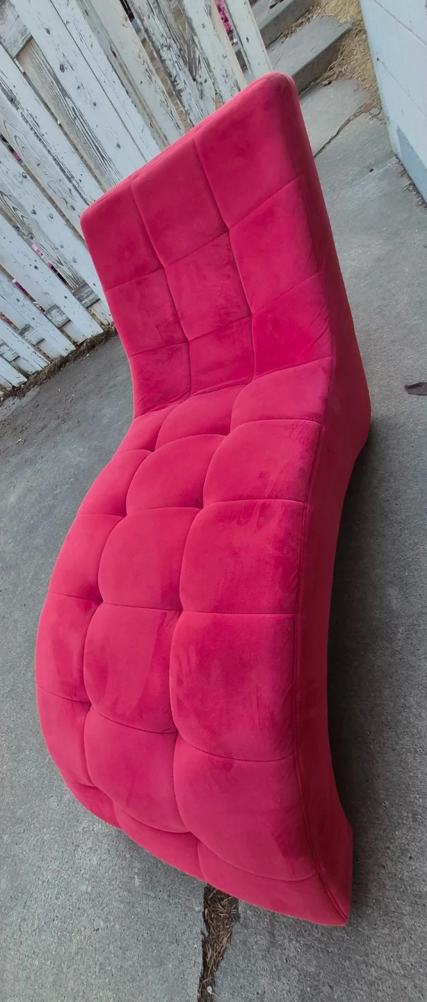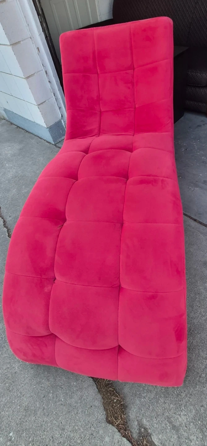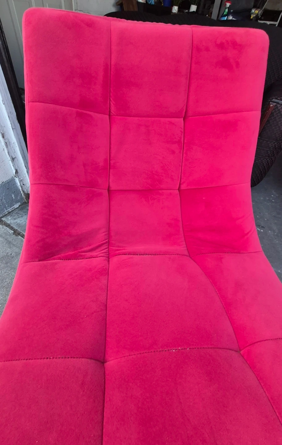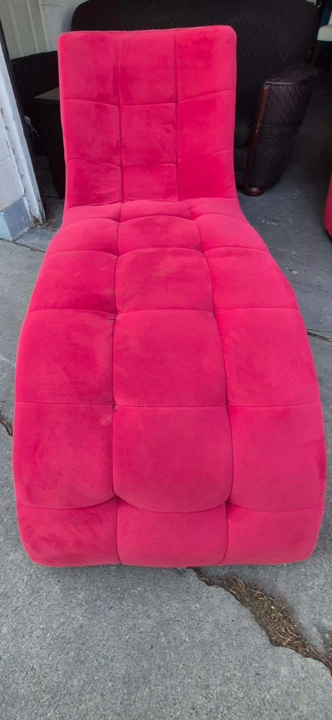 A vibrant pink chaise lounge chair with a tufted design. Its fabric appears to be a soft velvet material. Perfect for adding a pop of colour and comfort to any room. This lounge chair offers a stylish place to relax.
