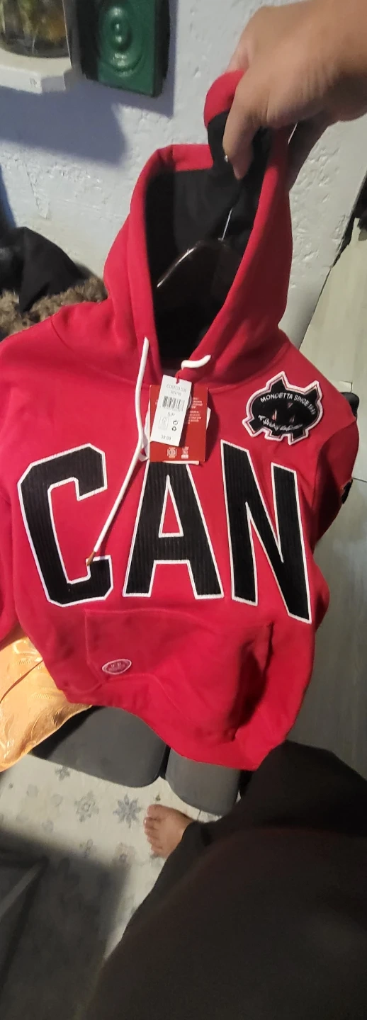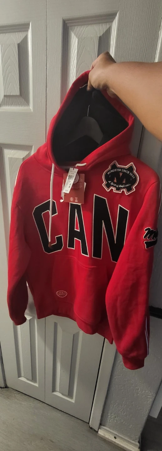 This red Mondetta hoodie proudly displays "CAN" on the front and a Canadian flag on the back. It's made with a comfortable fabric blend. This hoodie's perfect for showing Canadian pride! Medium