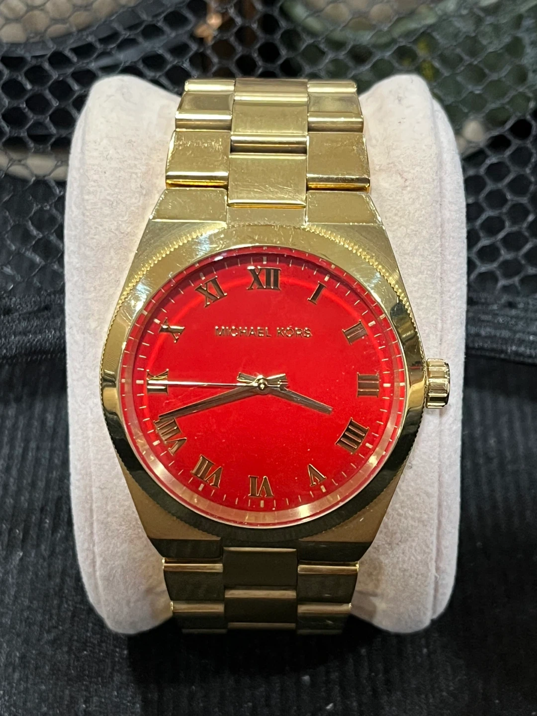 This is a Michael Kors watch with a gold-toned band and a vibrant red dial. It features Roman numeral hour markers. The watch is made of metal.