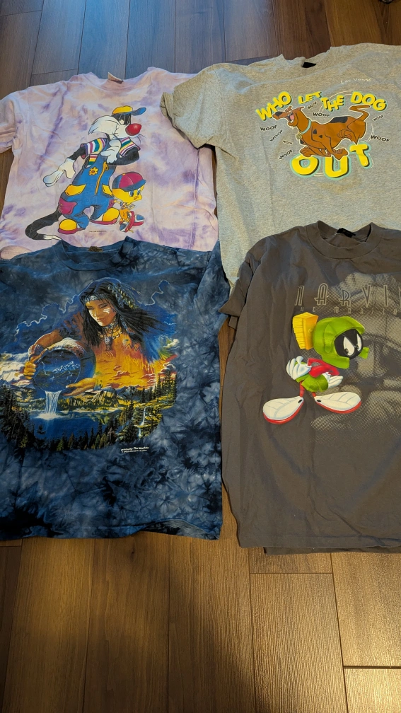 Four vintage graphic tees. Features Tweety and Sylvester, Scooby Doo, and Marvin the Martian. One features a Native American woman. Tie-dye designs included. Various colours