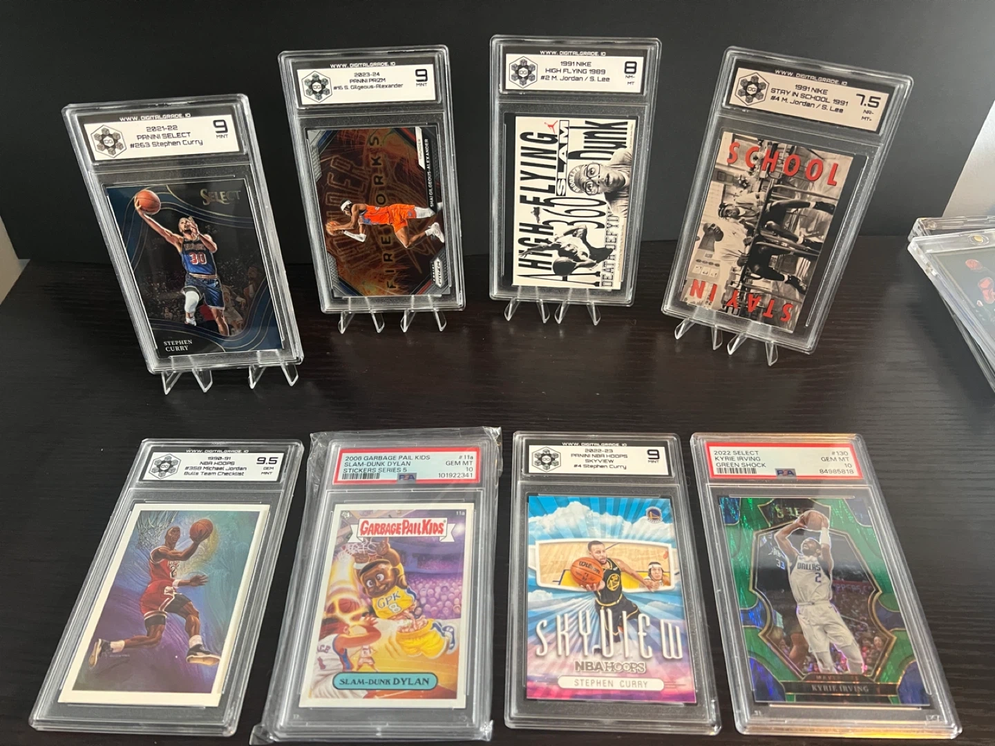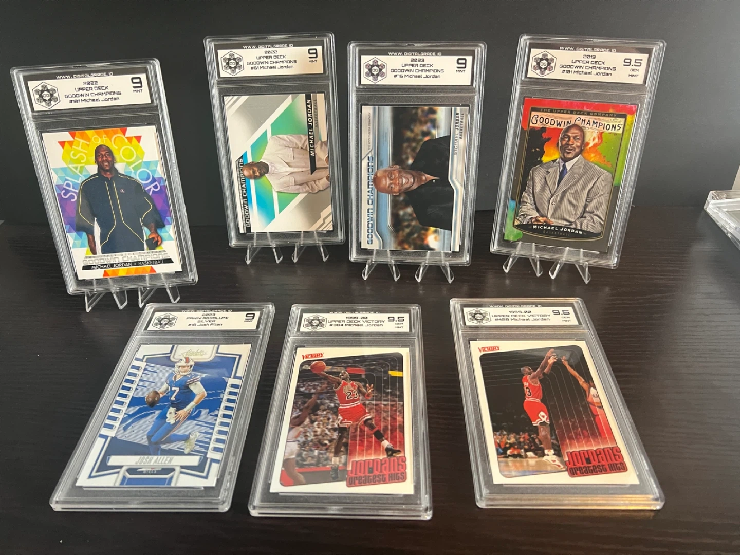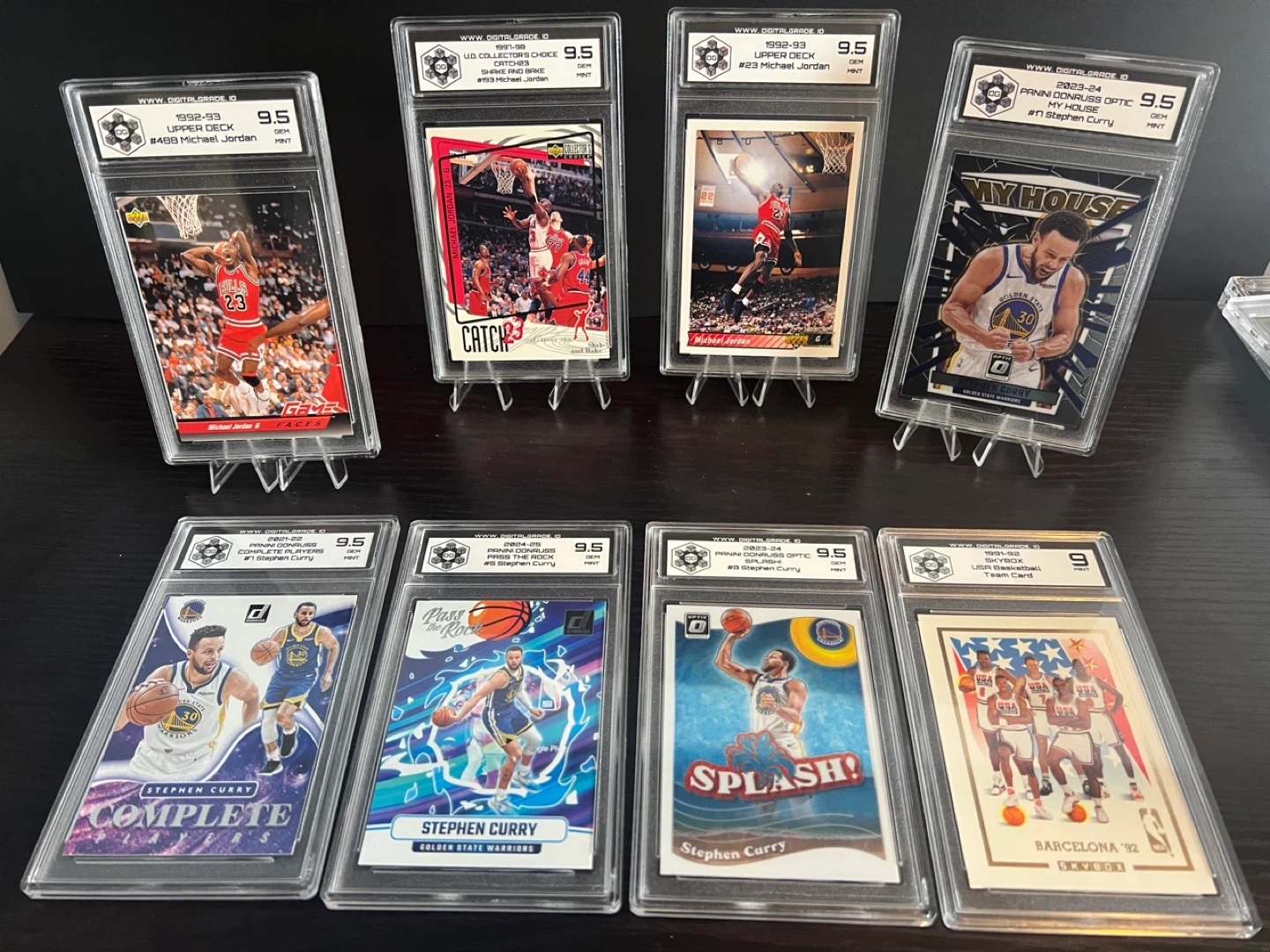 Multiple cards shown across the photos — including Michael Jordan, Steph Curry, and other stars.