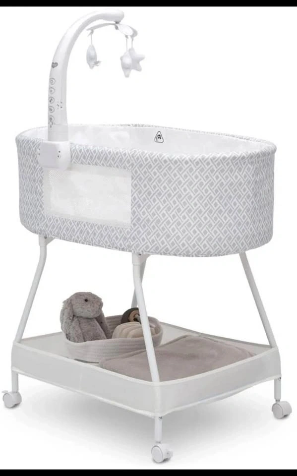 I'm selling a Delta Children bassinet, perfect for newborns and infants. It features a mobile with hanging toys and a calming vibration feature to help soothe your baby to sleep. The bassinet is in great condition and comes from a smoke-free home. Cash on pick up only please.