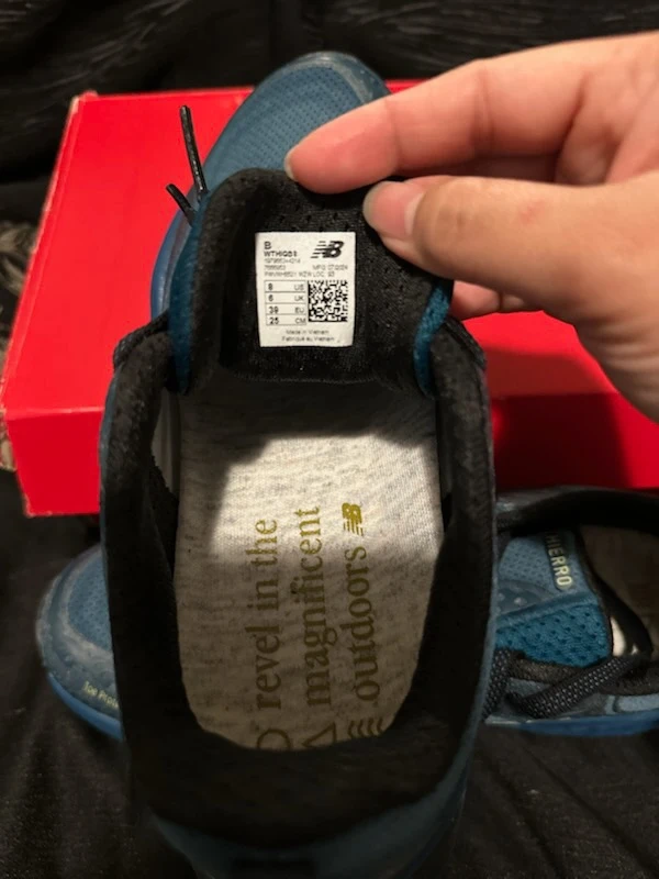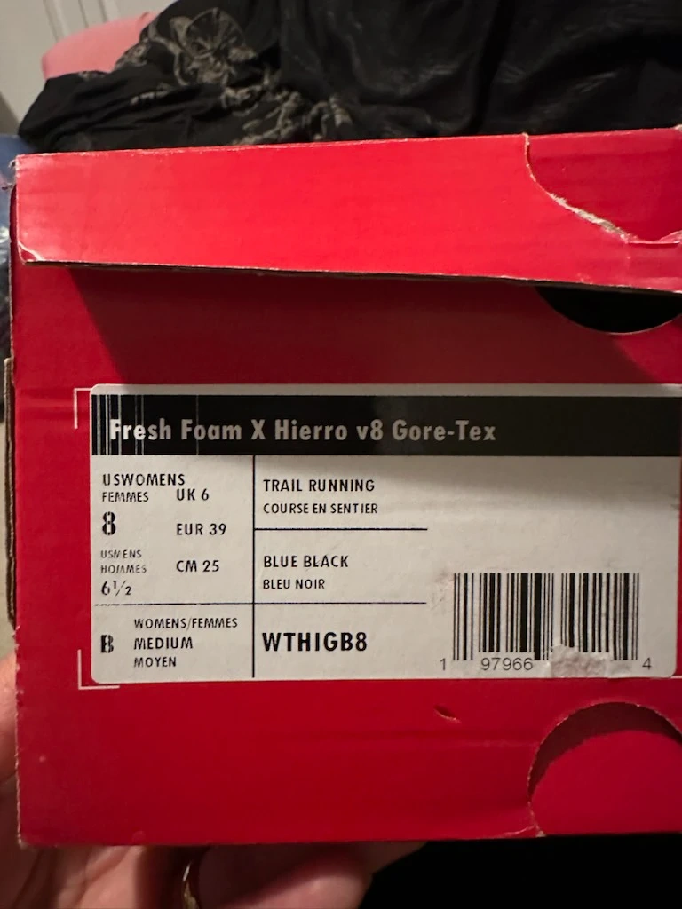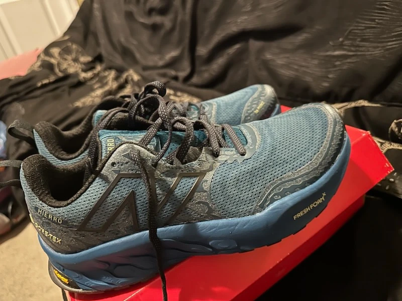 New Balance Fresh Foam X Hierro v8 trail running shoes with Gore-Tex. These blue black shoes are size 8 womens. They include the original box.