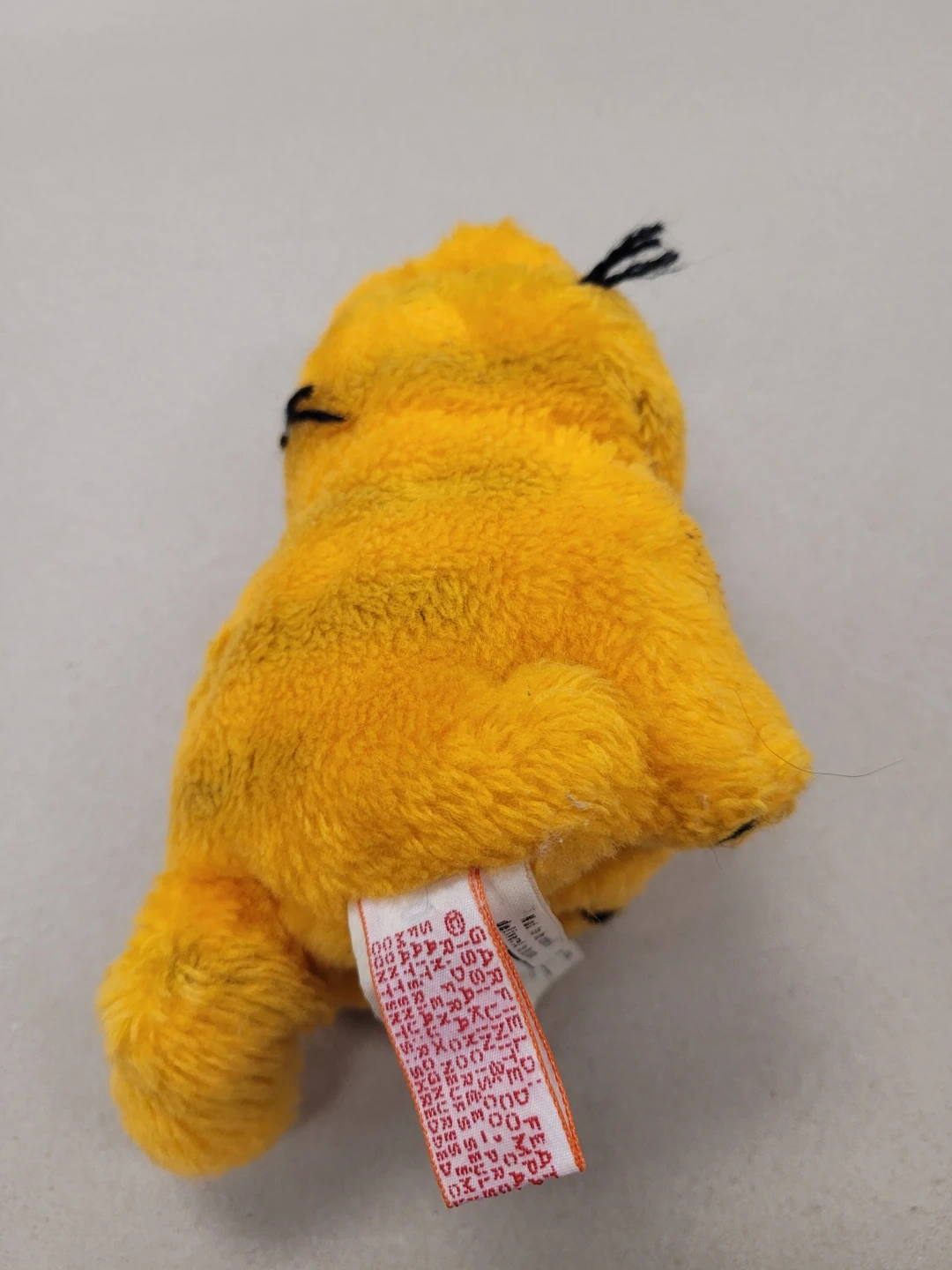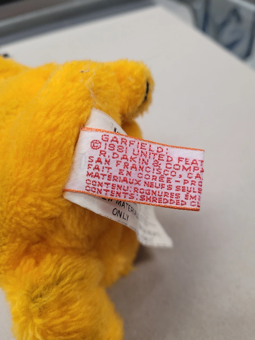 This is a vintage Garfield plush toy from 1981. It's made with a soft, fuzzy orange material. The filling consists of reclaimed fibres and nutshells.