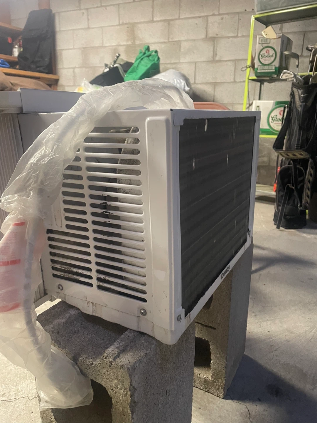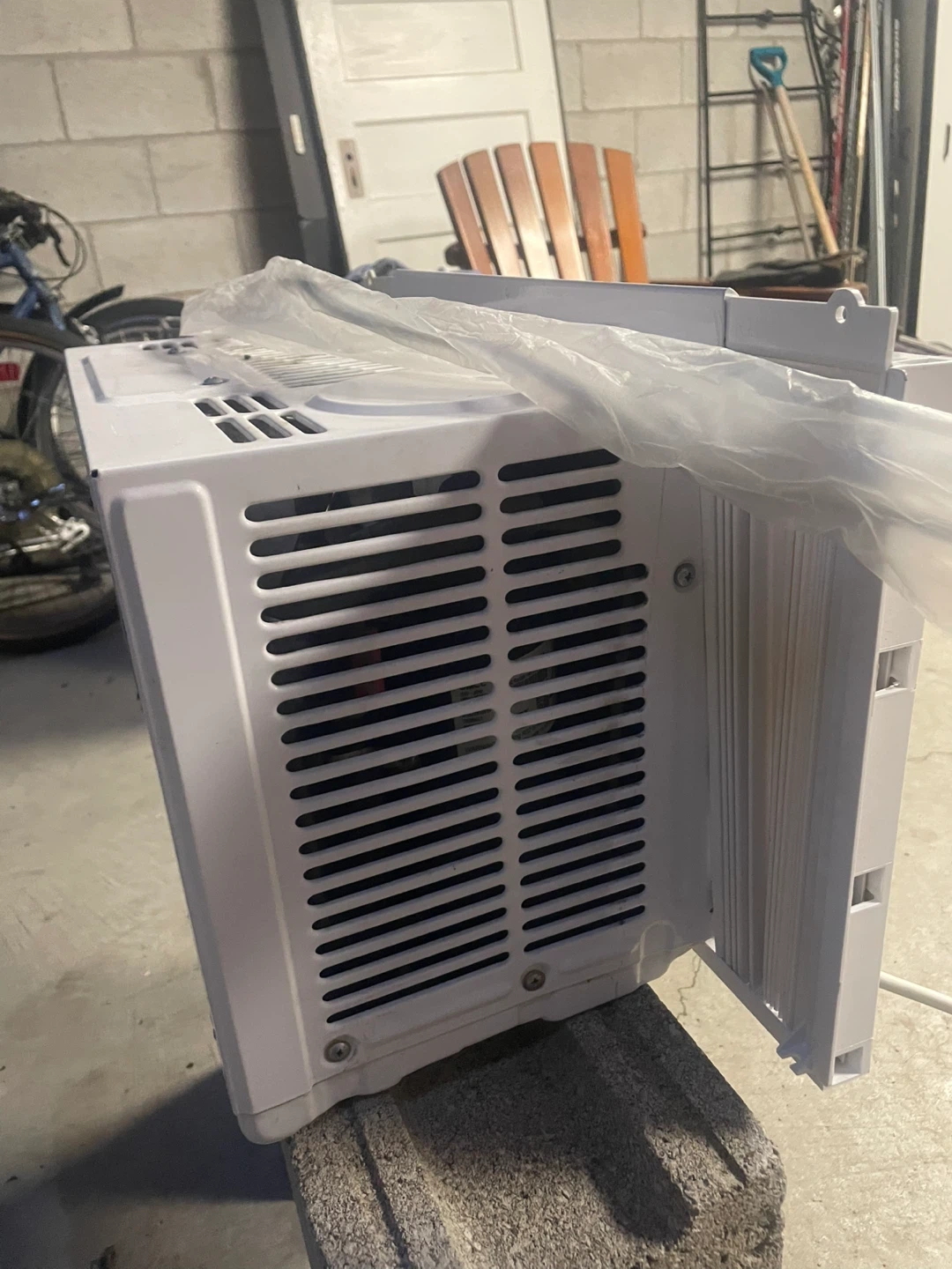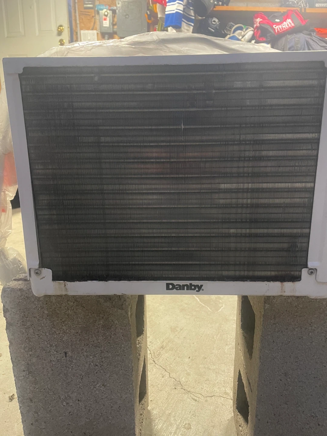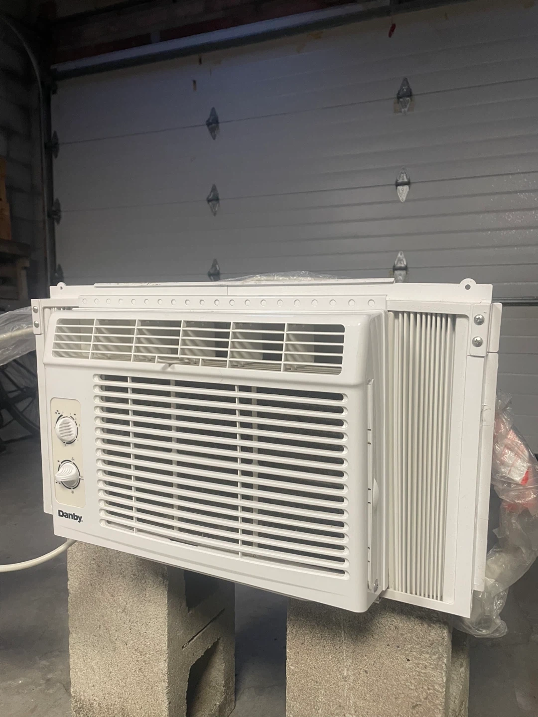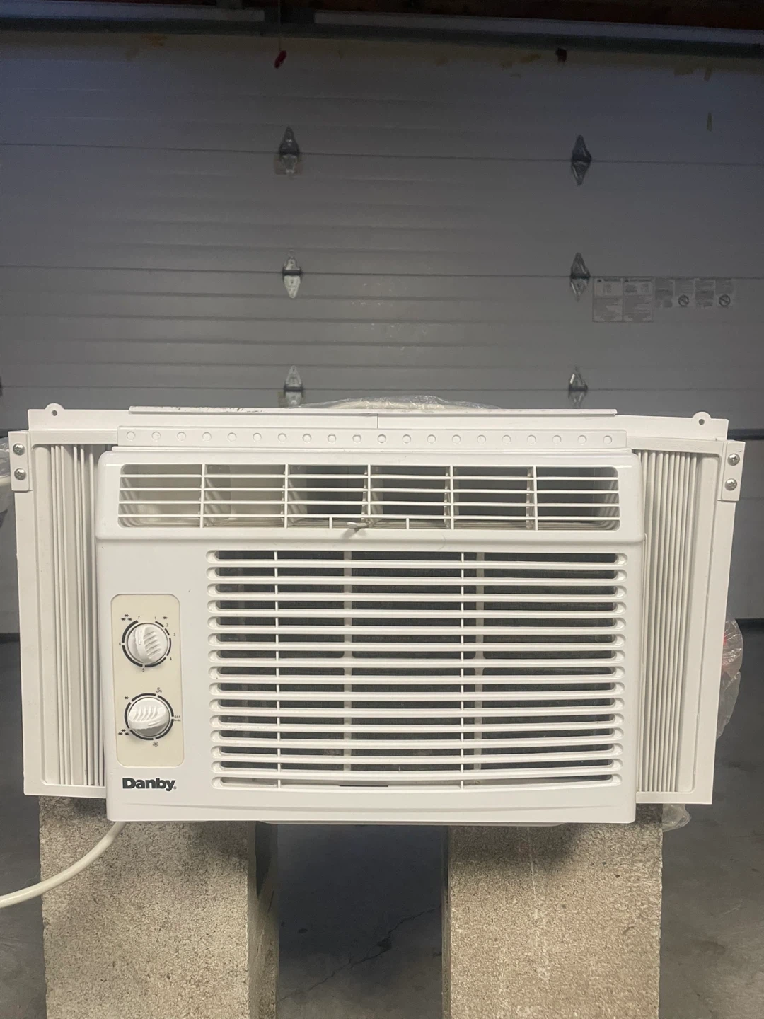 White Danby window air conditioner unit 5000 BTU. It's suitable for cooling a room. Includes adjustable side panels. Moved to a new place and can’t use it on any windows. Works well, only used it for 2 summers, never had an issue with it.