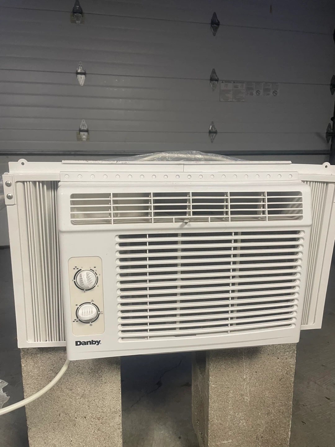 White Danby window air conditioner unit 5000 BTU. It's suitable for cooling a room. Includes adjustable side panels. Moved to a new place and can’t use it on any windows. Works well, only used it for 2 summers, never had an issue with it.