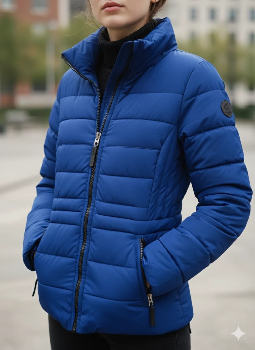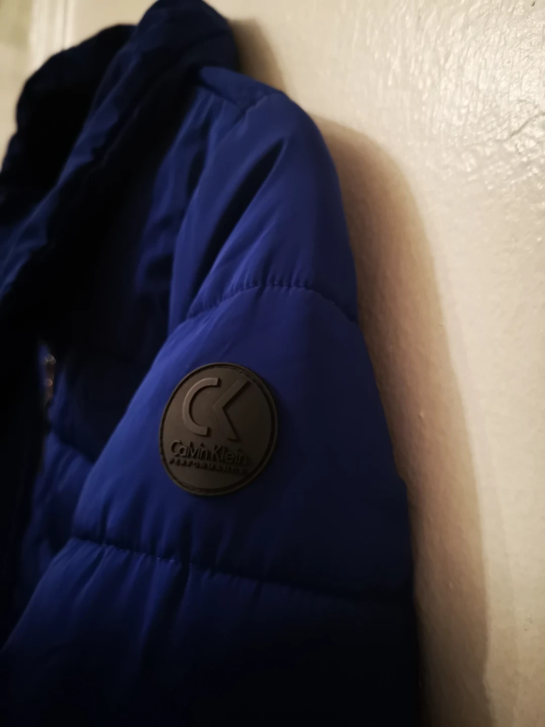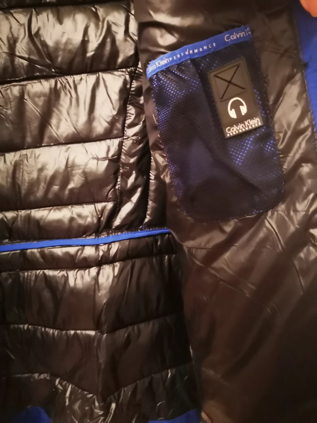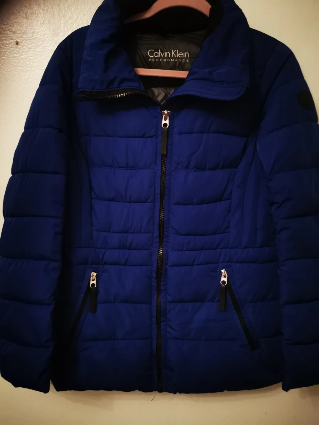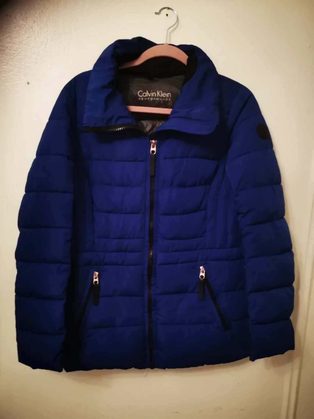 Here's a Calvin Klein Performance puffer jacket in a lovely blue color! It's in great condition and ready for a new owner. Perfect for staying warm and stylish during colder weather.