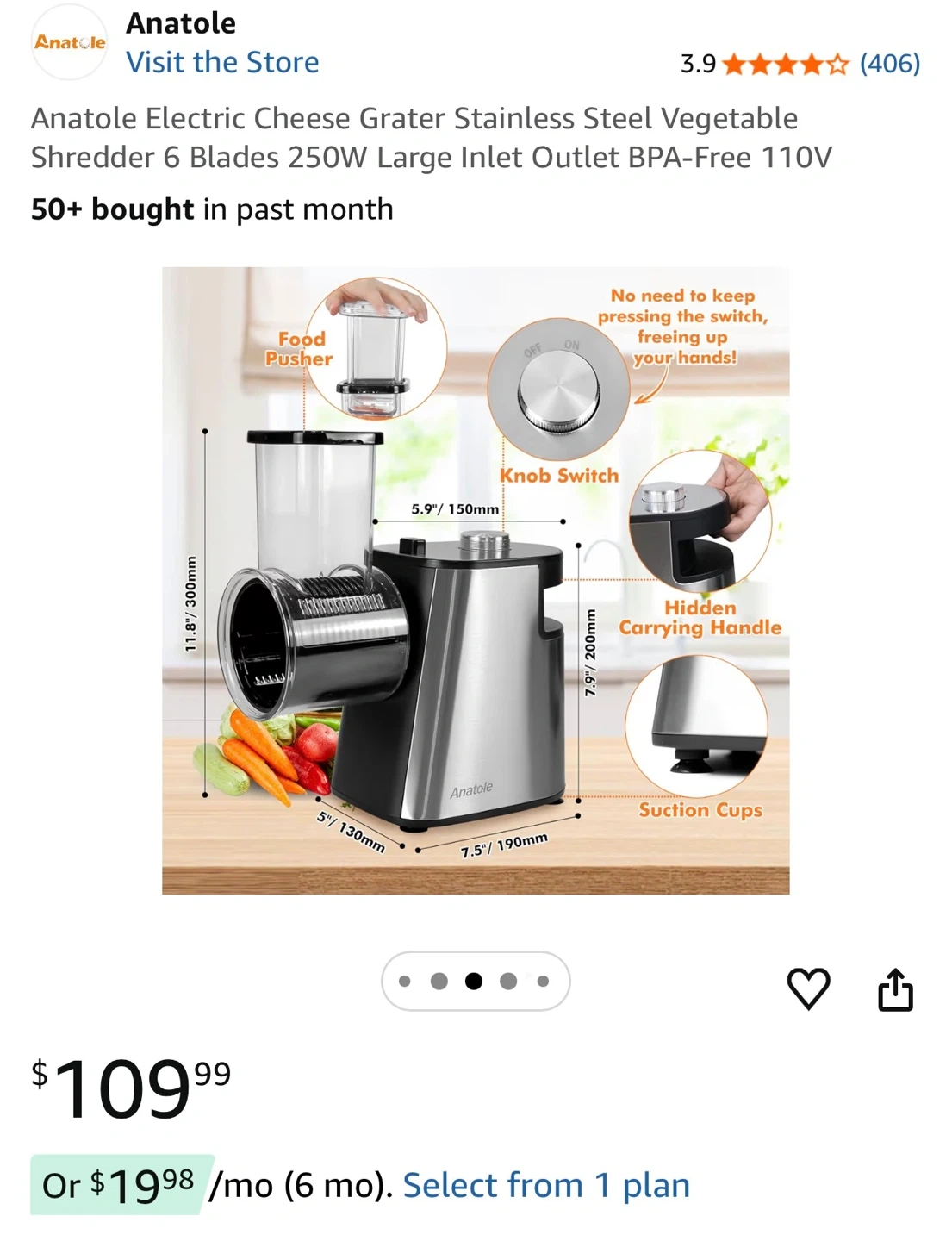 Anatole Electric Cheese Grater Stainless Steel Vegetable Shredder 6 Blades 250W Large Inlet Outlet BPA-Free 110V