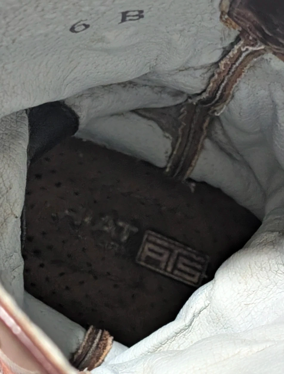 Brown leather cowboy boots with decorative stitching and star accents. Ariat branding visible on the sole and inside the boot. Size 6B.