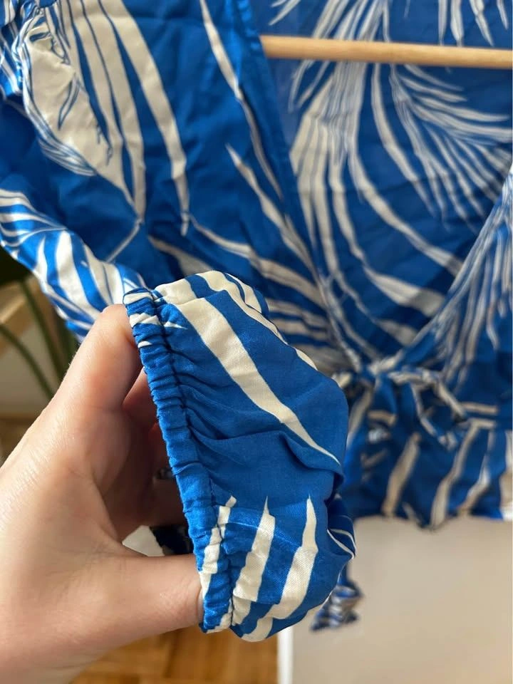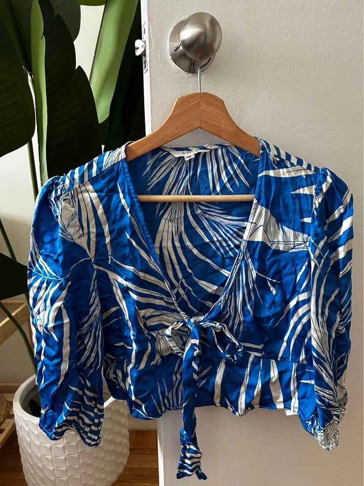 Cute Guess top with a blue and white leaf print! It's a size medium and in great condition. Perfect for summer!