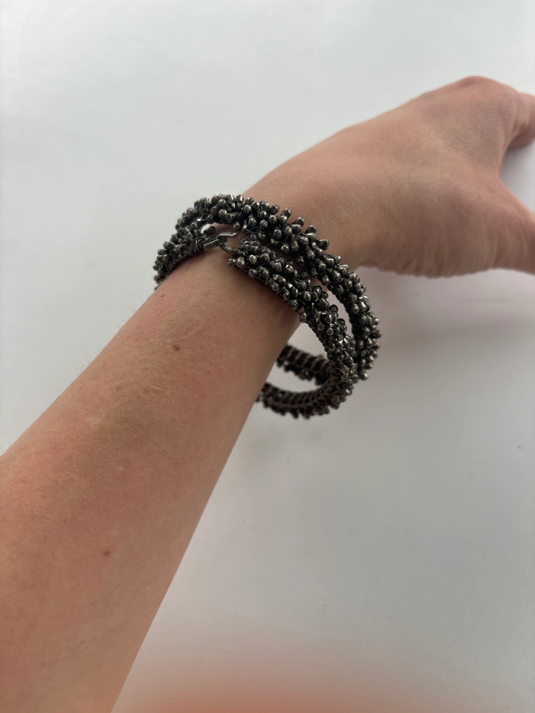 Two silver bangles with small beads throughout. They are open and can be adjusted to fit your wrist. $10 each