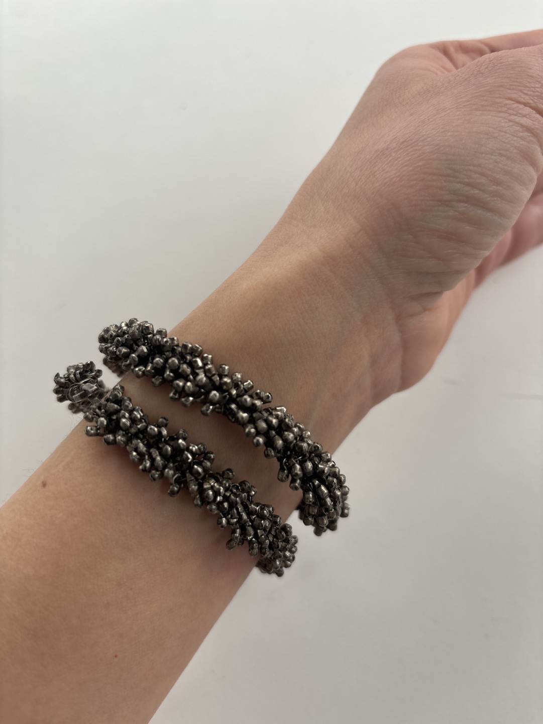 Two silver bangles with small beads throughout. They are open and can be adjusted to fit your wrist. $10 each