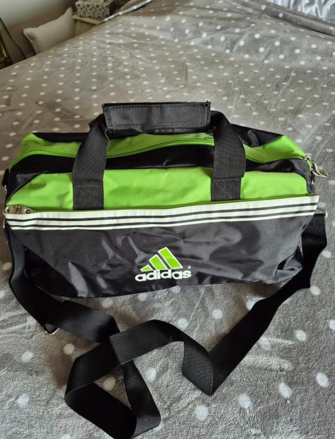 Adidas duffel bag in black and lime green. It has a shoulder strap and two handles. Great for gym or travel! It is smaller, 17 inches across.