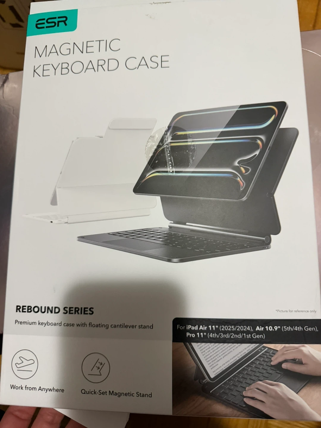This is an ESR Rebound Series magnetic keyboard case. It has a premium keyboard with a floating cantilever stand. It's designed for iPad Air 11" (2025/2024), Air 10.9" (5th/4th Gen), and Pro 11" (4th/3rd/2nd/1st Gen). Work from anywhere with this quick-set magnetic stand!