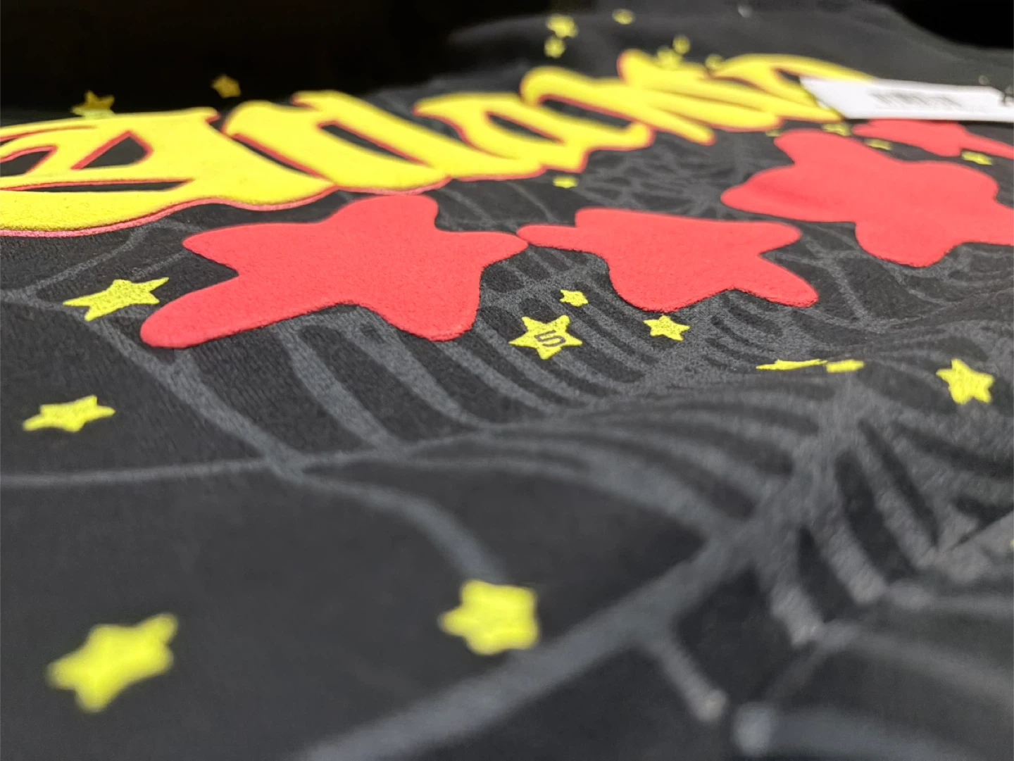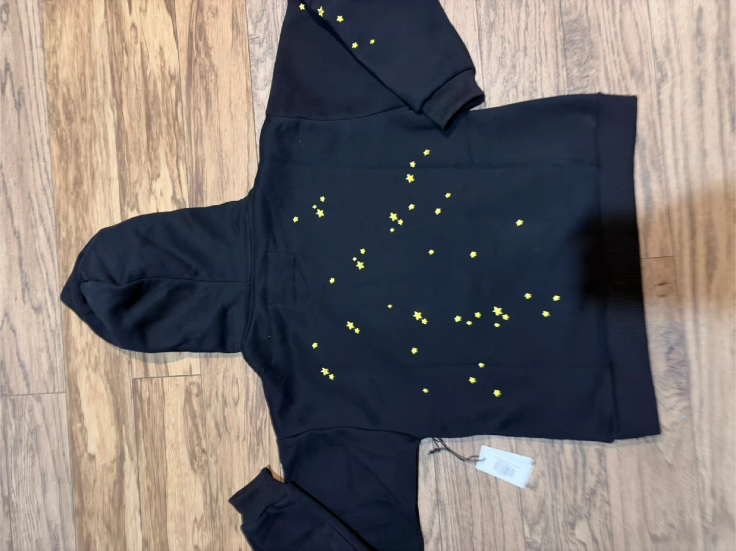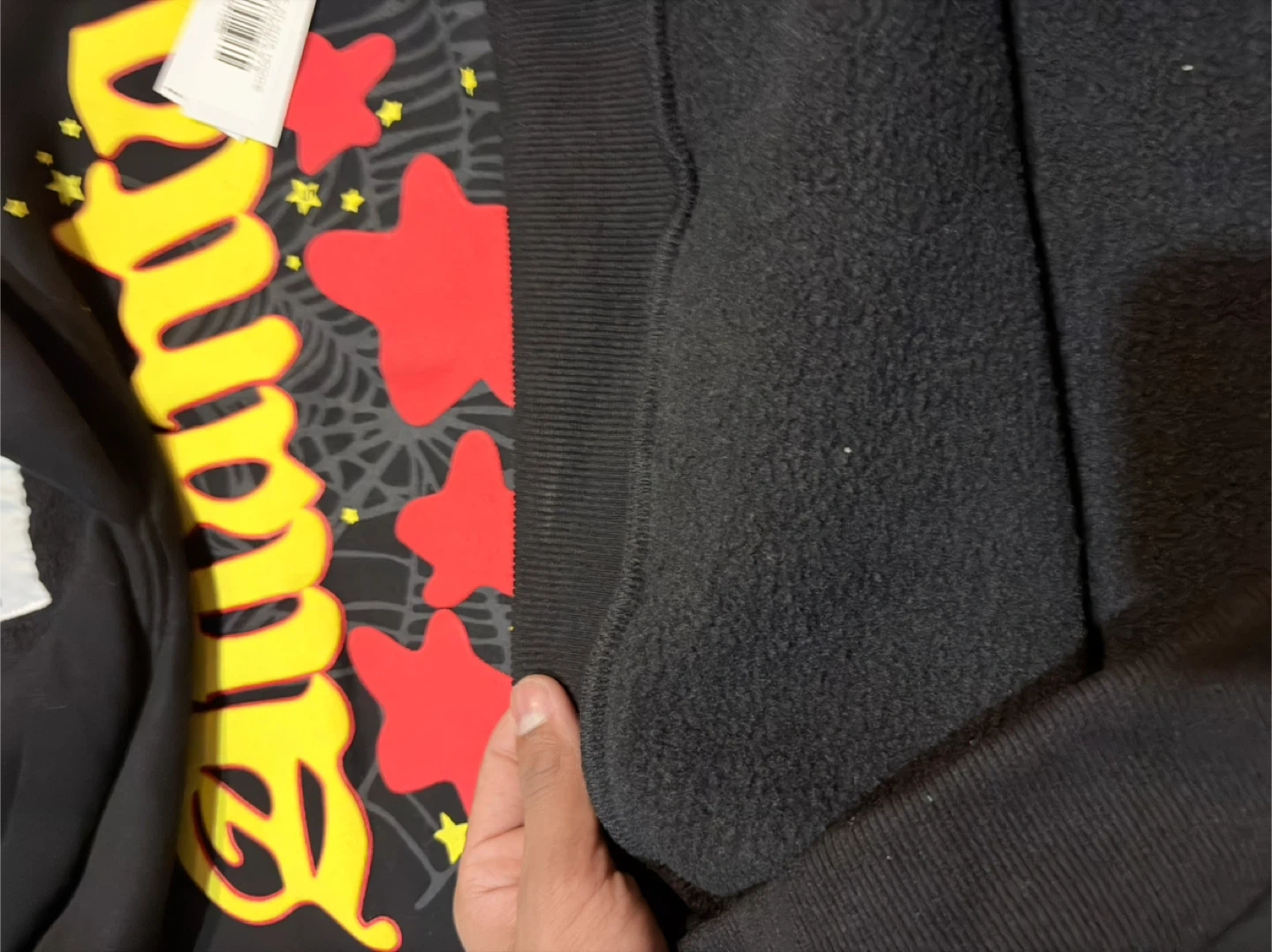 Black SPIDER hoodie with "Atlanta" graphic and spider web design. Features red stars and yellow accents. It's made of soft material. Perfect for cooler weather!