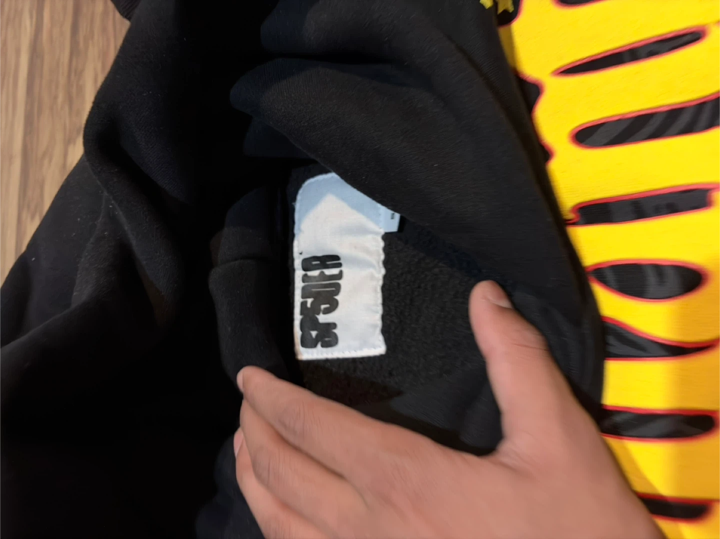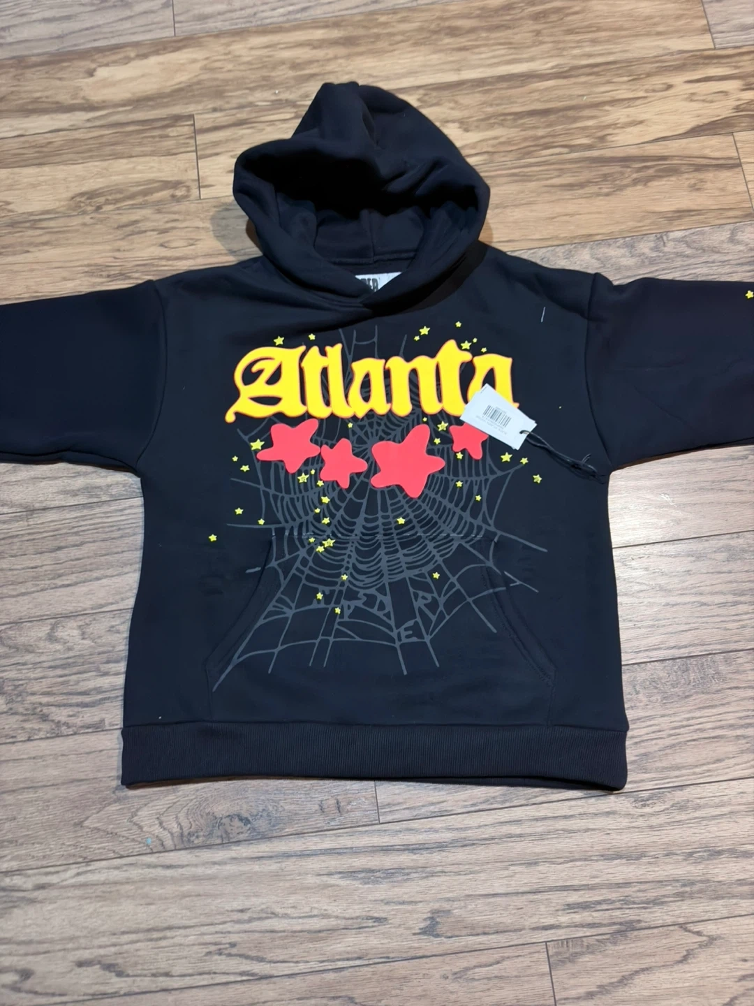 Black SPIDER hoodie with "Atlanta" graphic and spider web design. Features red stars and yellow accents. It's made of soft material. Perfect for cooler weather!