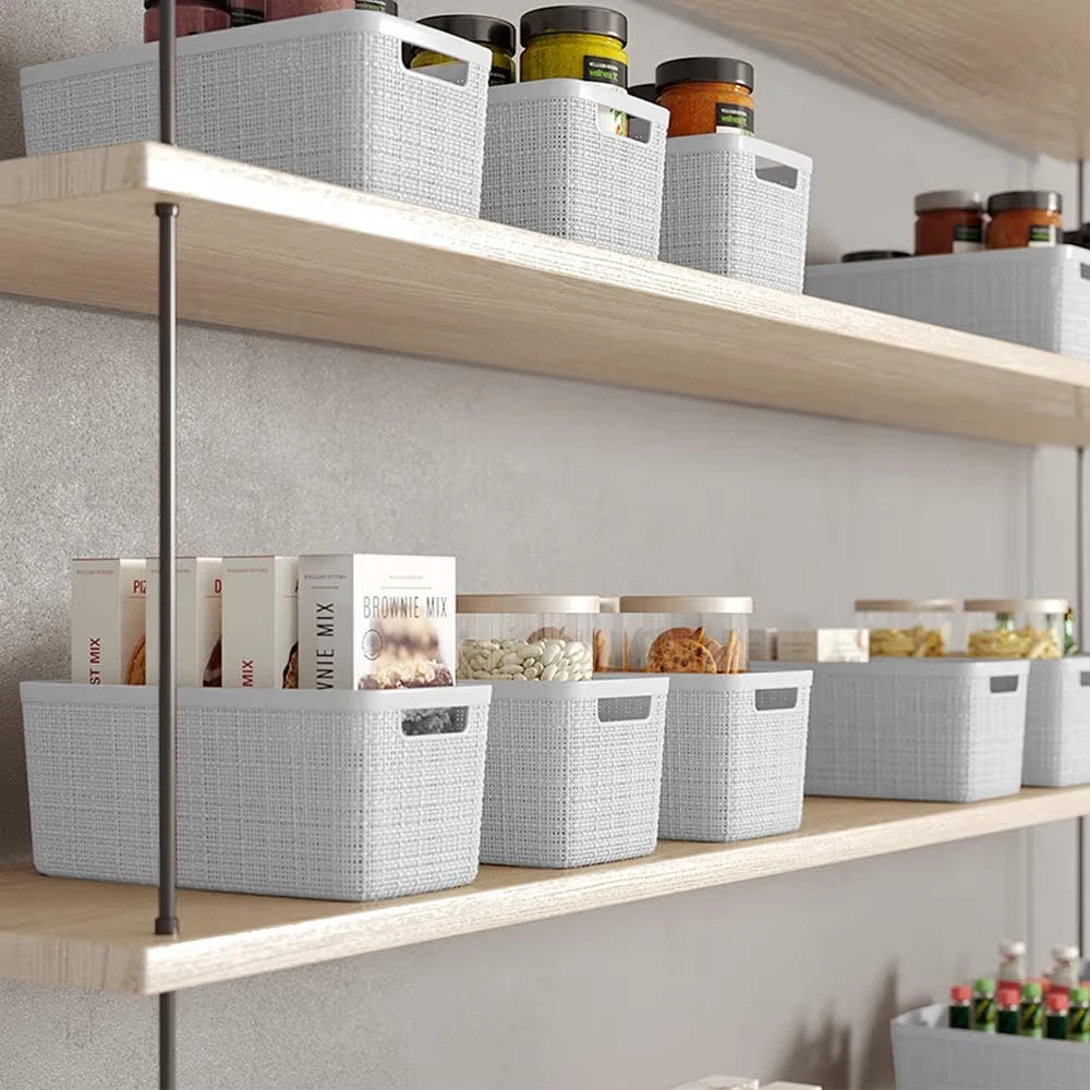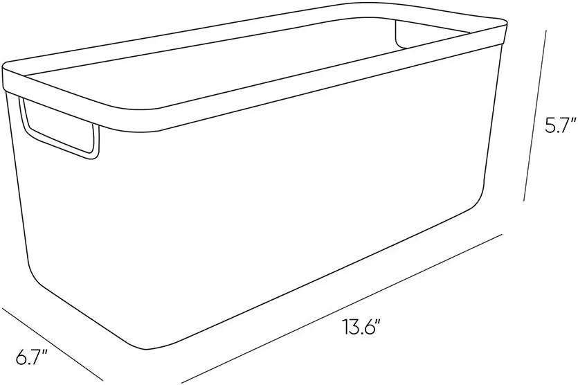 This white storage basket is perfect for organizing your home. It's made of durable plastic with a woven texture and integrated handles for easy carrying. Dimensions are 13.6" L x 6.7" W x 5.7" H. Use it for pantry items, craft supplies, or bathroom essentials!