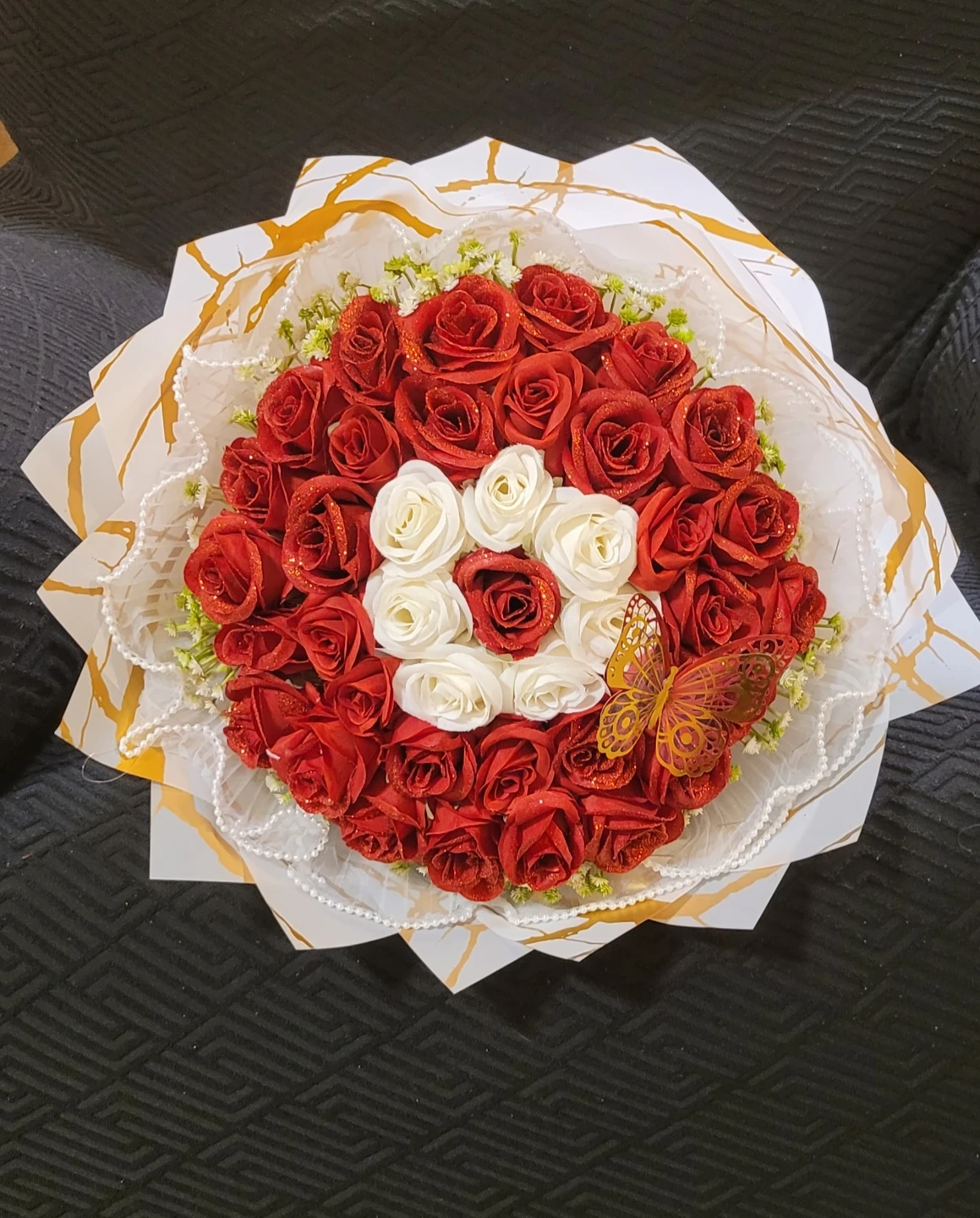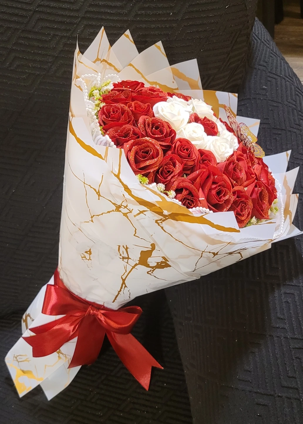 A beautiful bouquet featuring many red and white artificial roses, accented with a decorative butterfly and pearl beads. It's wrapped in marbled paper with a satin ribbon tie. This arrangement is perfect for gifting or decoration.
