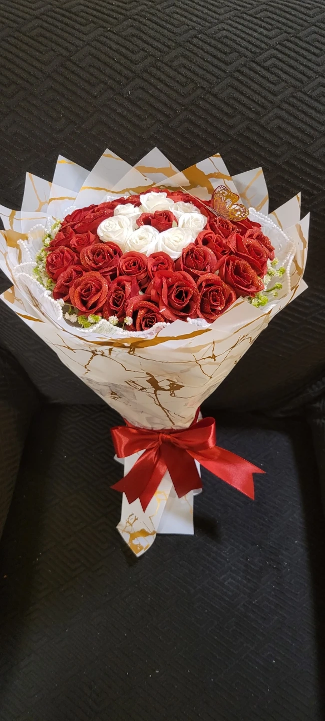 A beautiful bouquet featuring many red and white artificial roses, accented with a decorative butterfly and pearl beads. It's wrapped in marbled paper with a satin ribbon tie. This arrangement is perfect for gifting or decoration.