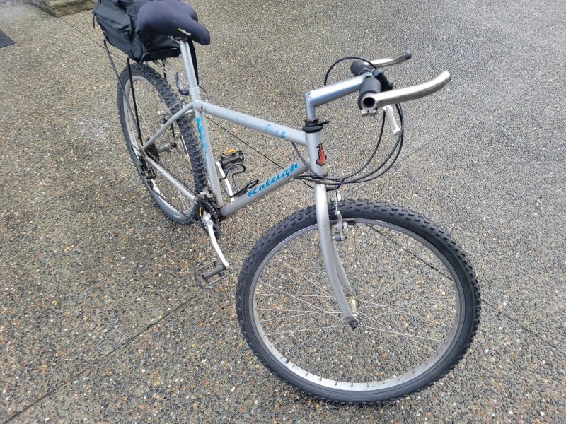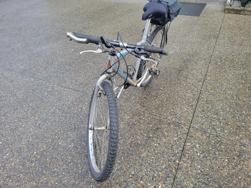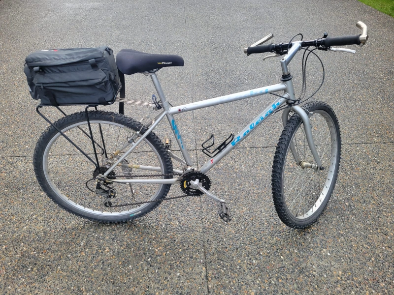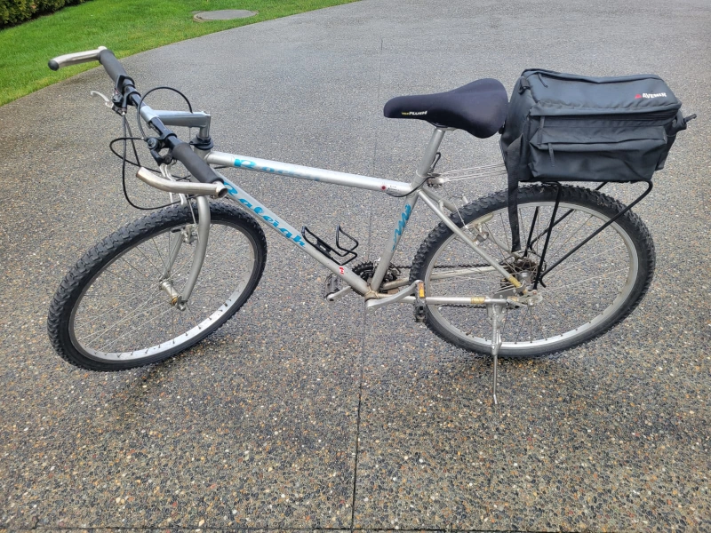 Vintage Raleigh Mount Bike.Silver coloured frame. Equipped with a rear rack and pannier bag. Shows some wear from use and age. Porch pick up Douglas Crossing area