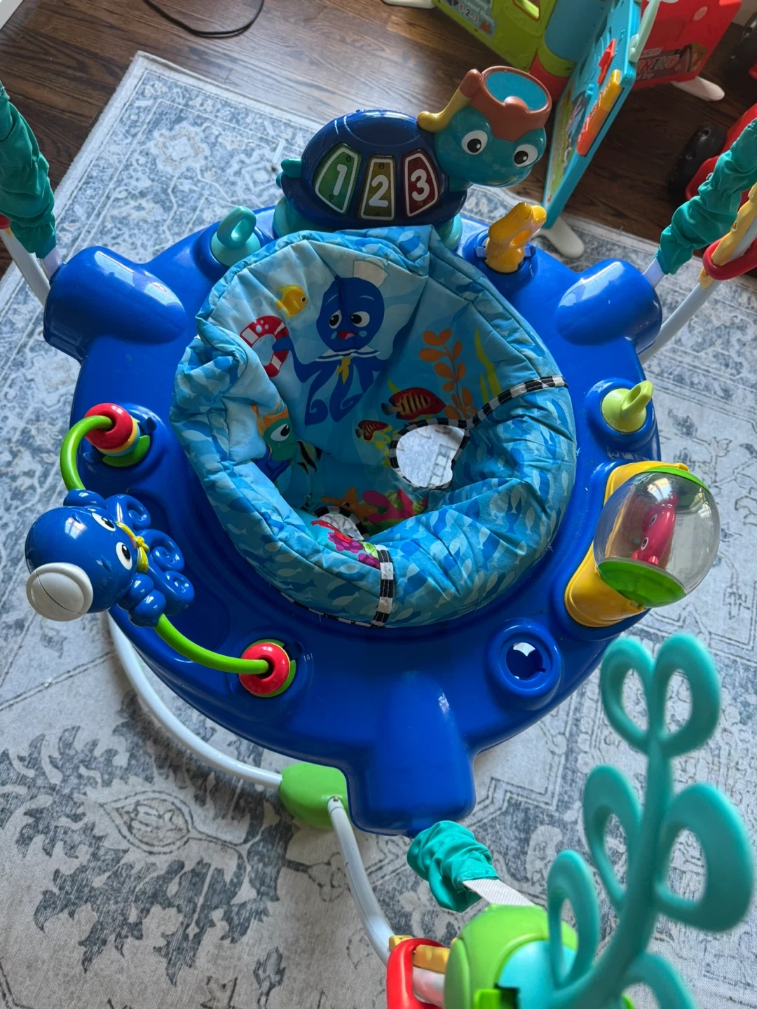 This Baby Einstein activity jumper is a great way to keep your little one entertained! It features a variety of toys and activities to stimulate your baby's senses and help them develop important motor skills. It's in good condition and ready for a new home!
