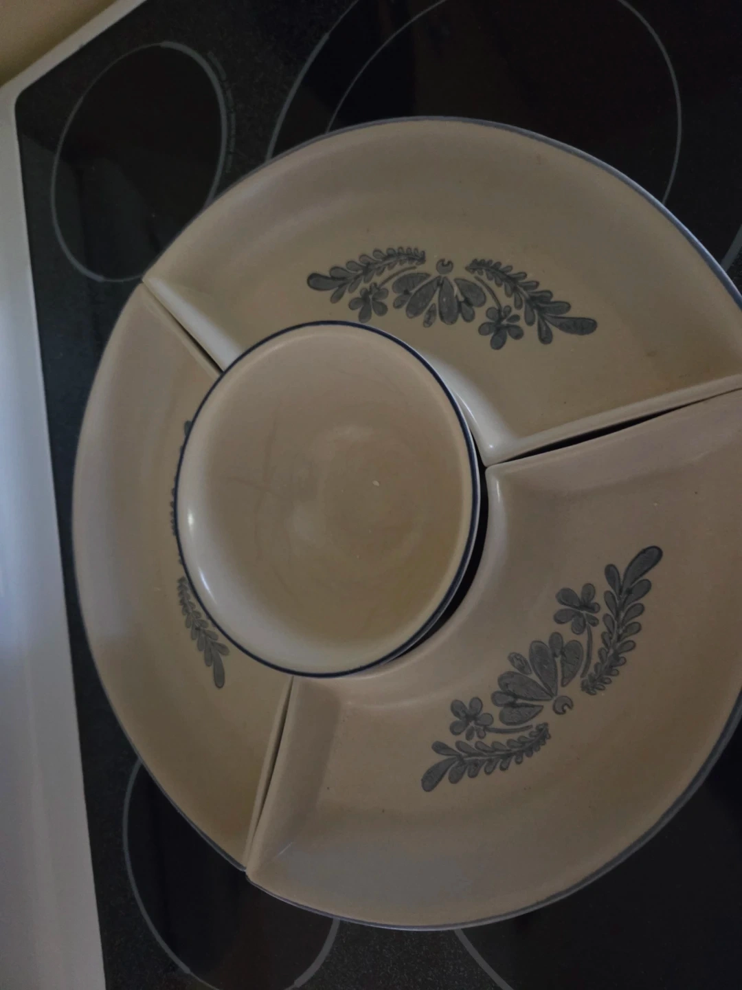 Cream coloured divided serving platter with a blue floral pattern. It includes a removable centre bowl. Great for snacks or appetizers!