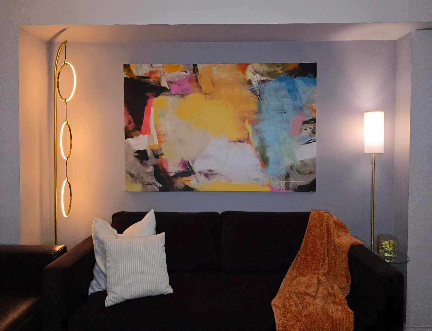 This is the 'Courage' framed PRINTED canvas art. It's 60 inches high by 40 inches wide. It features an abstract design with vibrant colours. It's perfect for adding a modern touch to your living space!