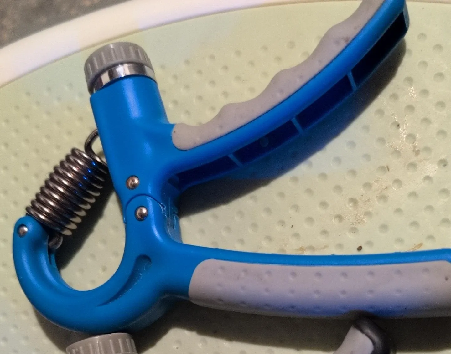 This is a blue and grey hand gripper exerciser. It features a strong spring for resistance. The handles have a textured grip for comfort. Useful for hand and forearm strength training!