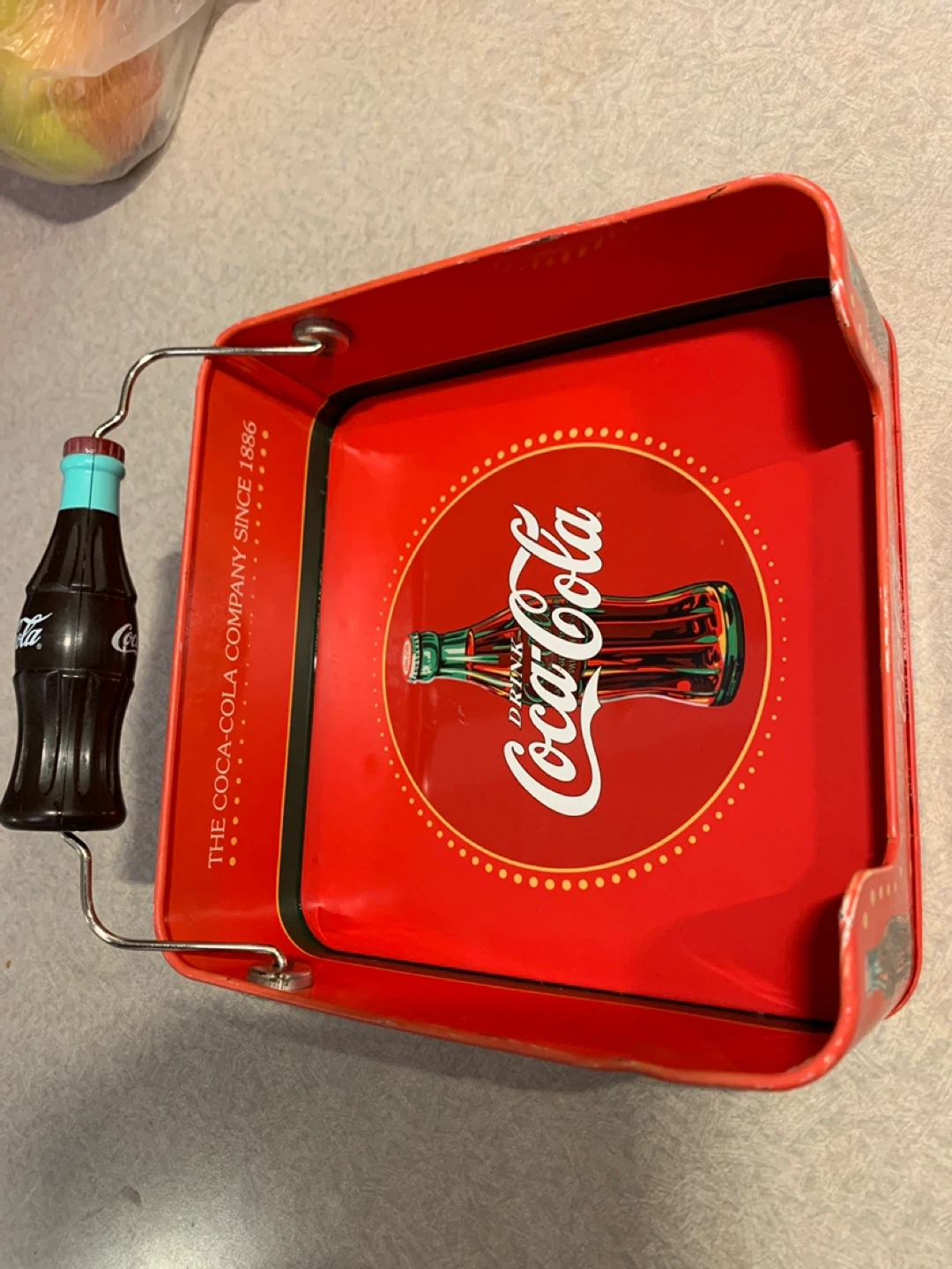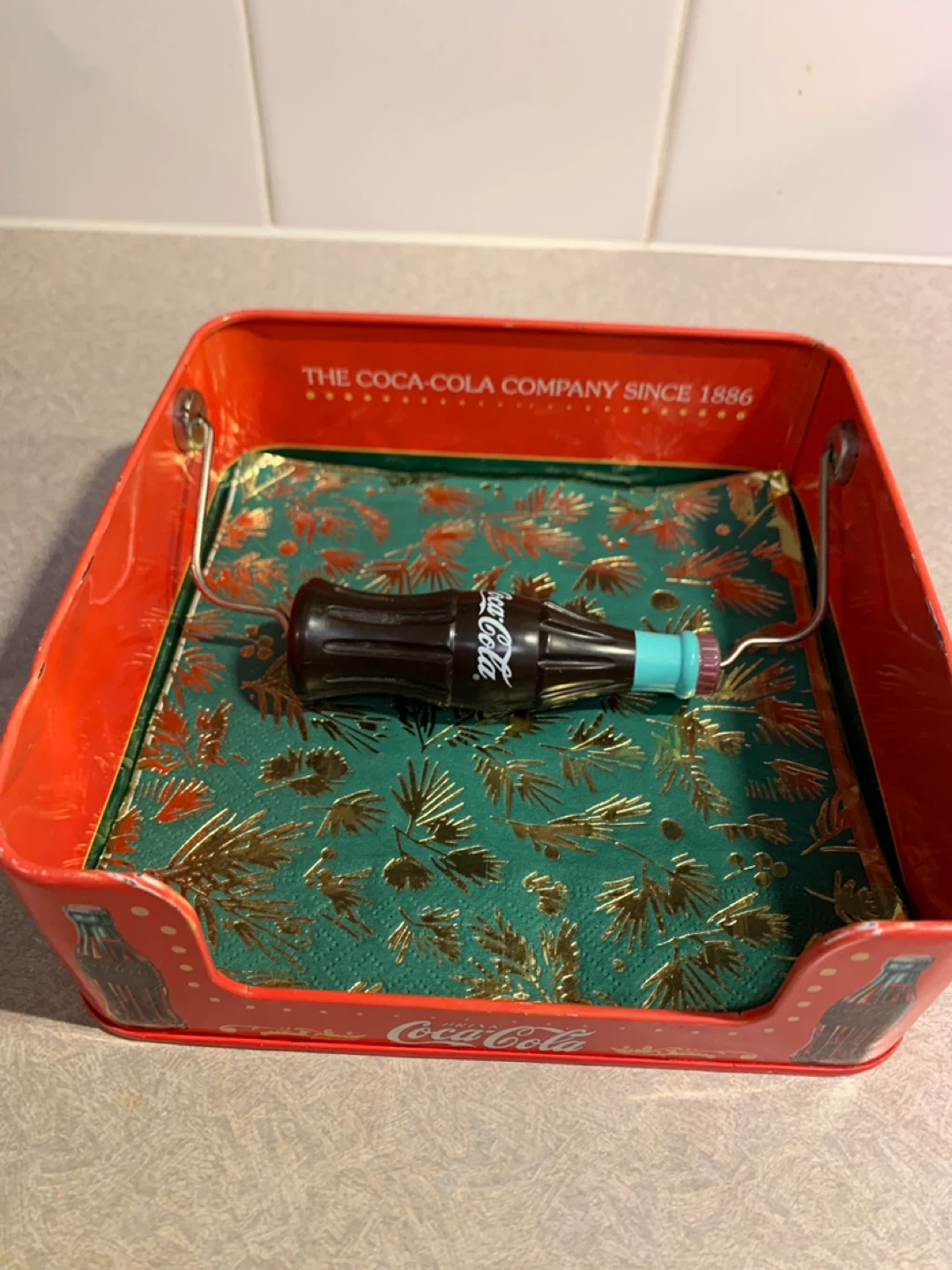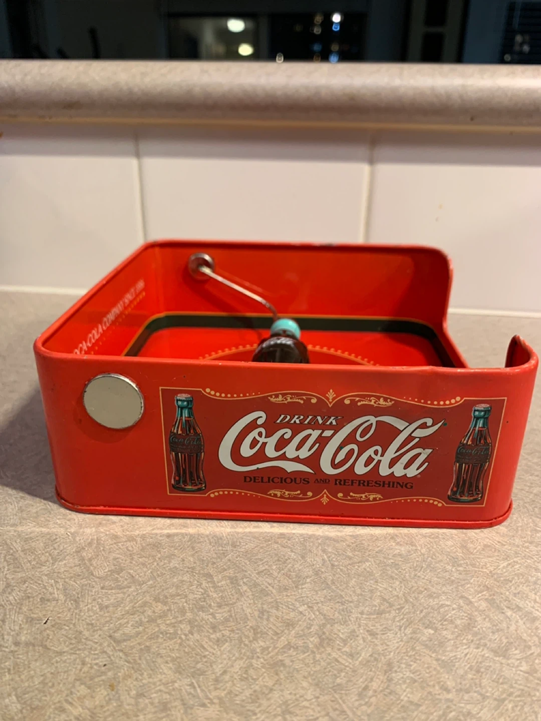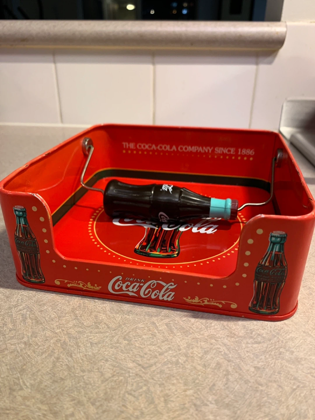 This red metal napkin holder features classic Coca-Cola branding. It has a decorative bottle design holding the napkins in place. It's a neat retro addition for your kitchen or dining table!