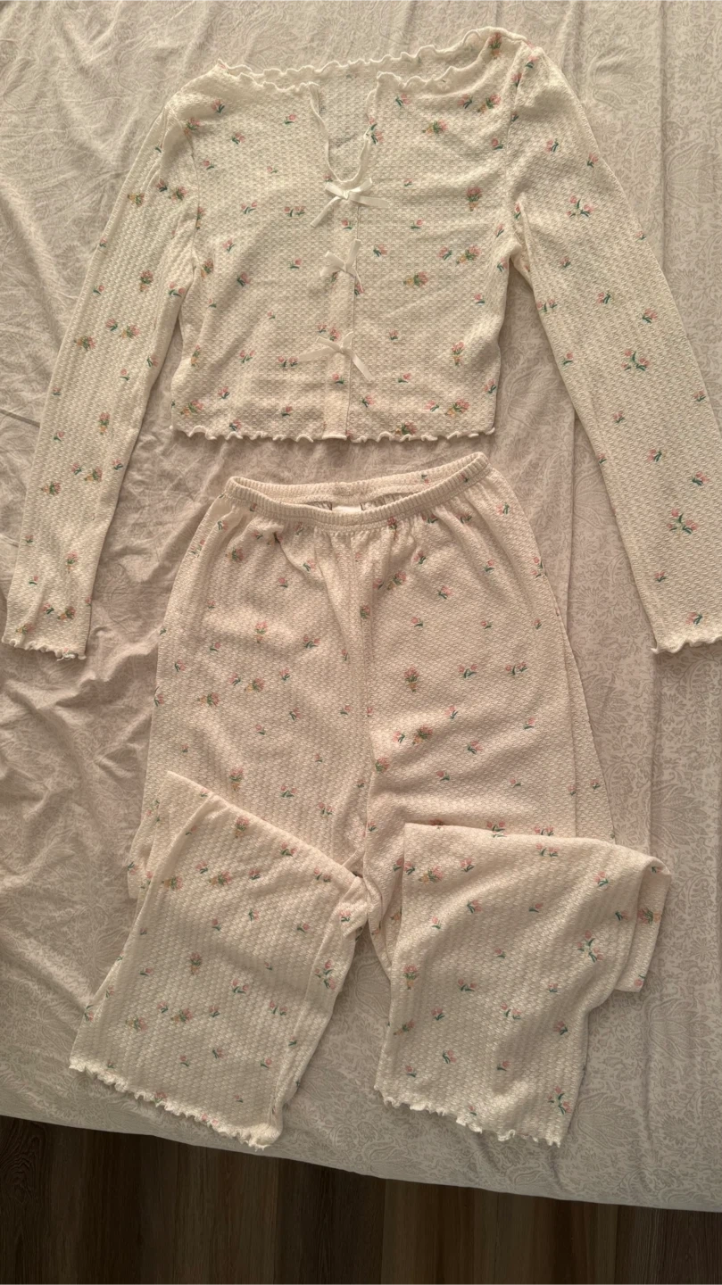 Cream waffle knit pajama set with a delicate pink and green floral print. Top features a V-neck with a tie closure and button-up front. Pants have an elastic waistband. Size small.