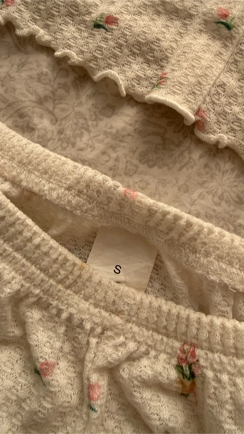 Cream waffle knit pajama set with a delicate pink and green floral print. Top features a V-neck with a tie closure and button-up front. Pants have an elastic waistband. Size small.